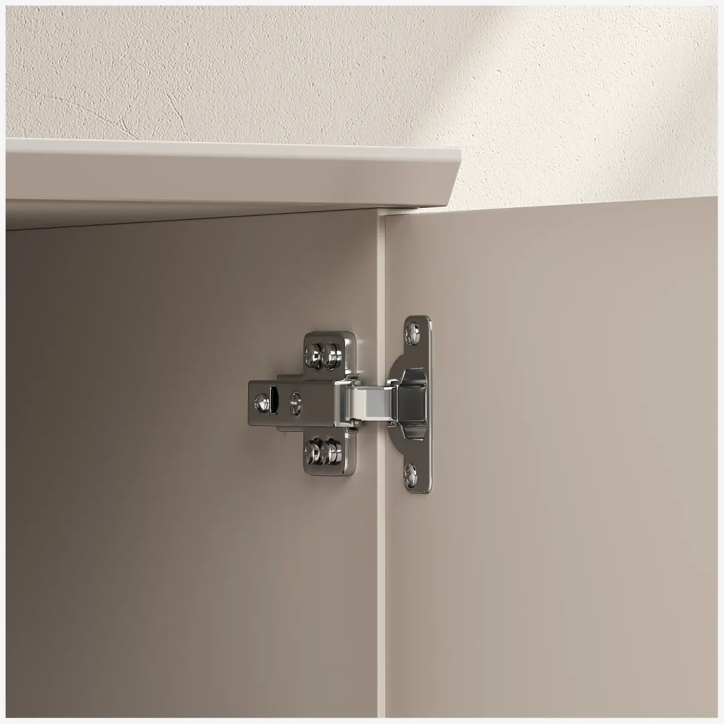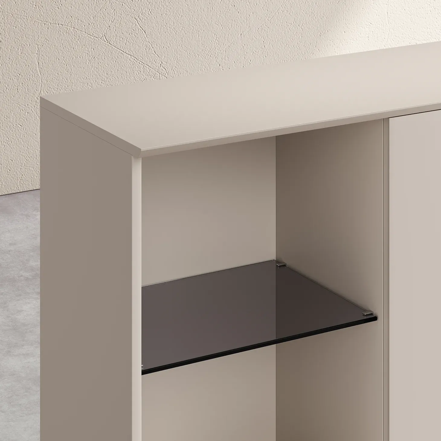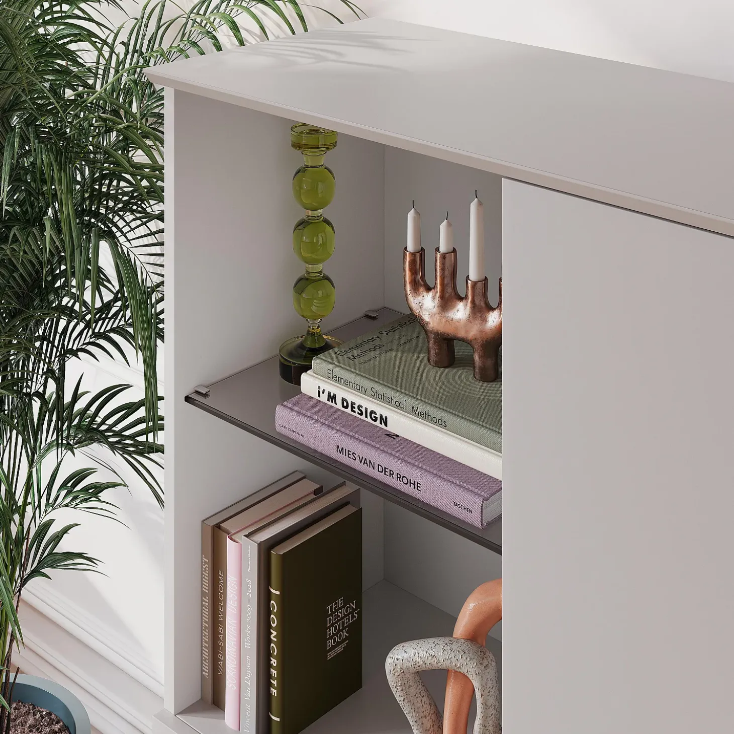 Son design structuré intègre trois portes qui dissimulent de nombreux compartiments, idéaux pour organiser la vaisselle, le linge de maison ou les objets du quotidien. Une niche ouverte, soulignée d’une tablette en verre trempé, permet de mettre en valeur des éléments décoratifs avec discrétion.