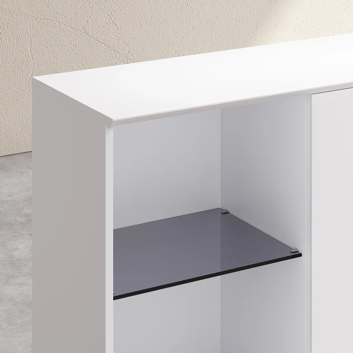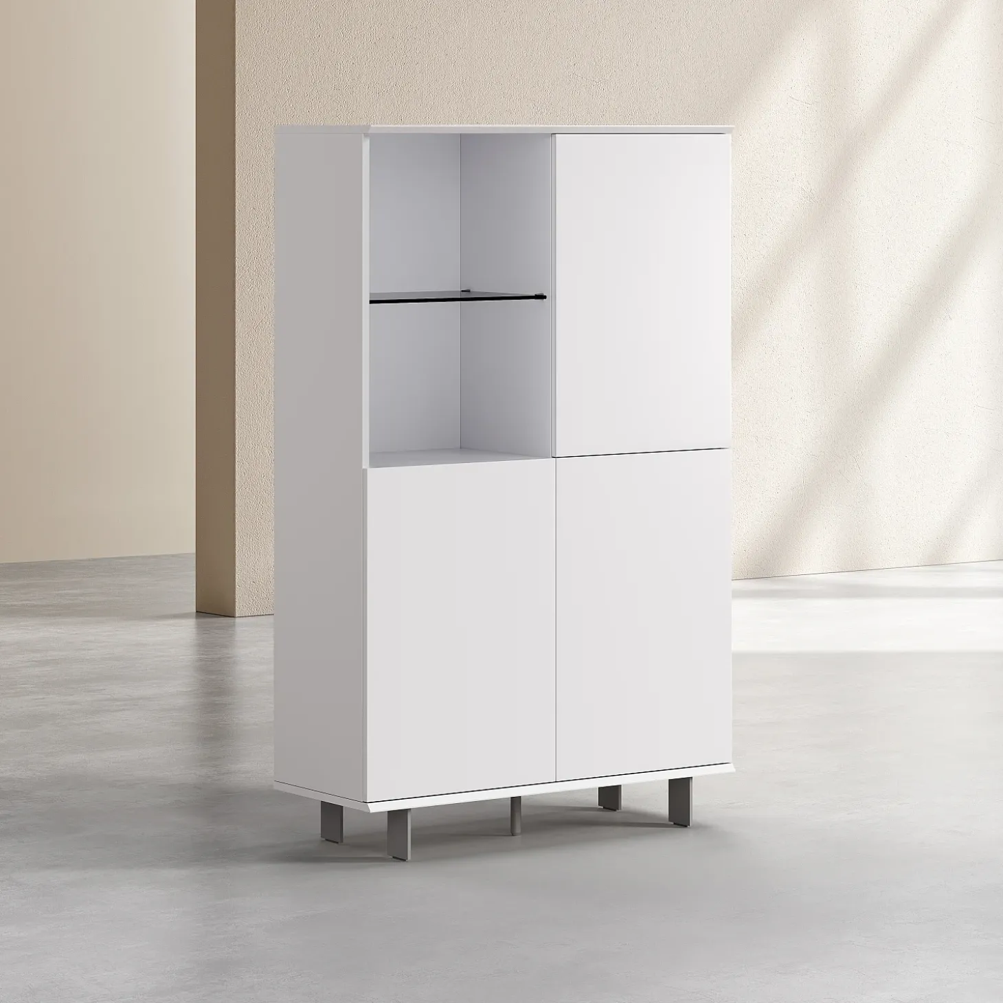 Sa composition intègre trois portes dissimulant plusieurs compartiments, parfaits pour organiser la vaisselle, les textiles ou les objets du quotidien. Une niche ouverte, rehaussée d’une tablette en verre trempé, permet de mettre en valeur des éléments décoratifs en toute simplicité.