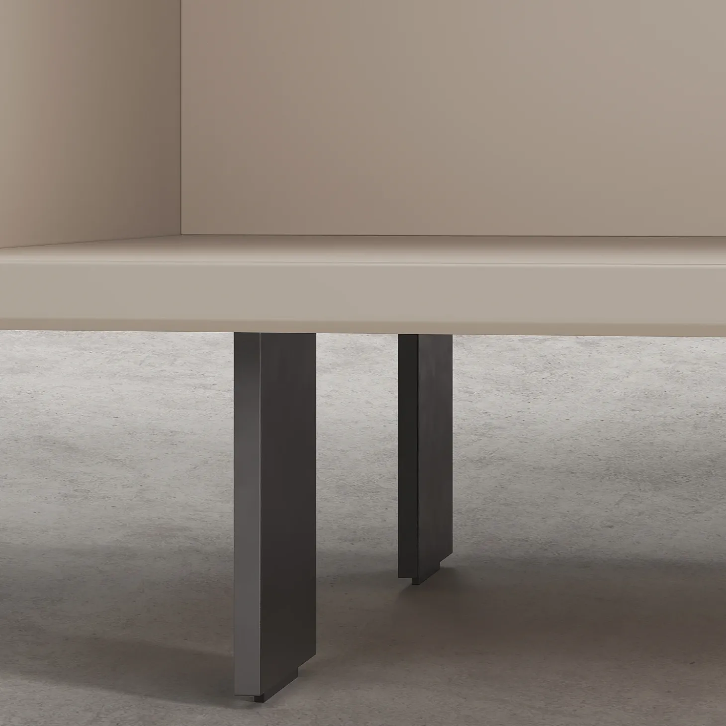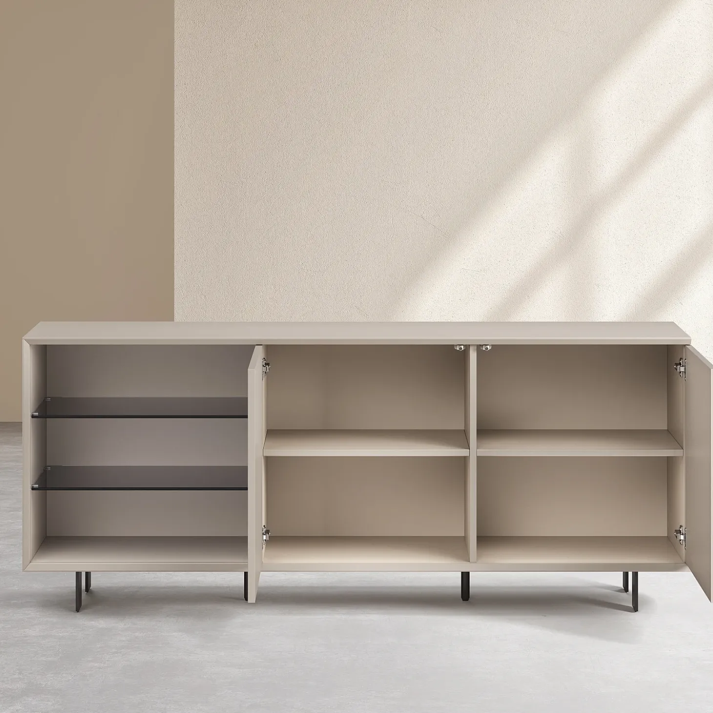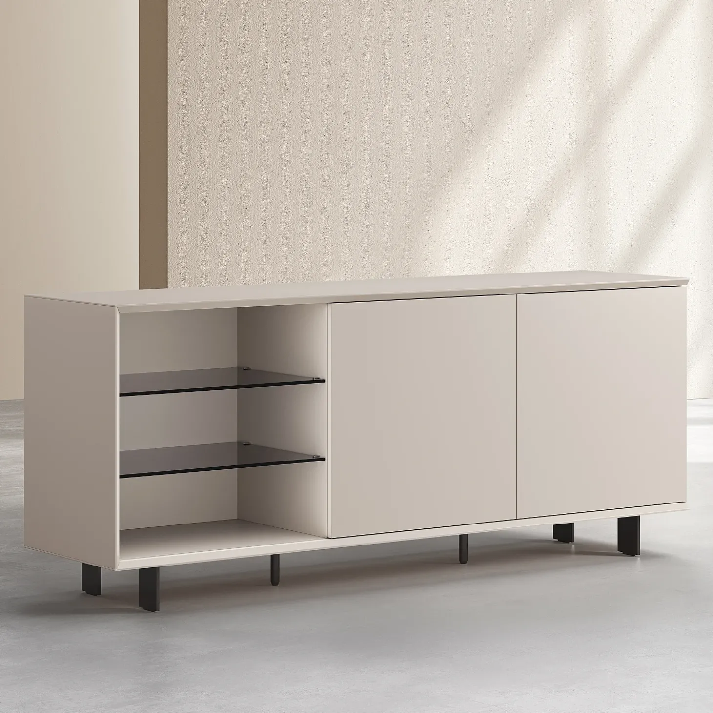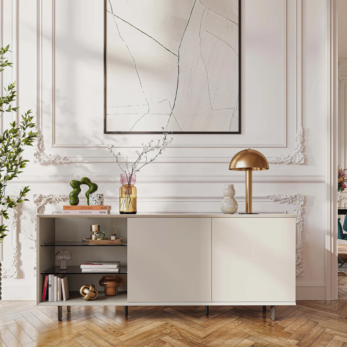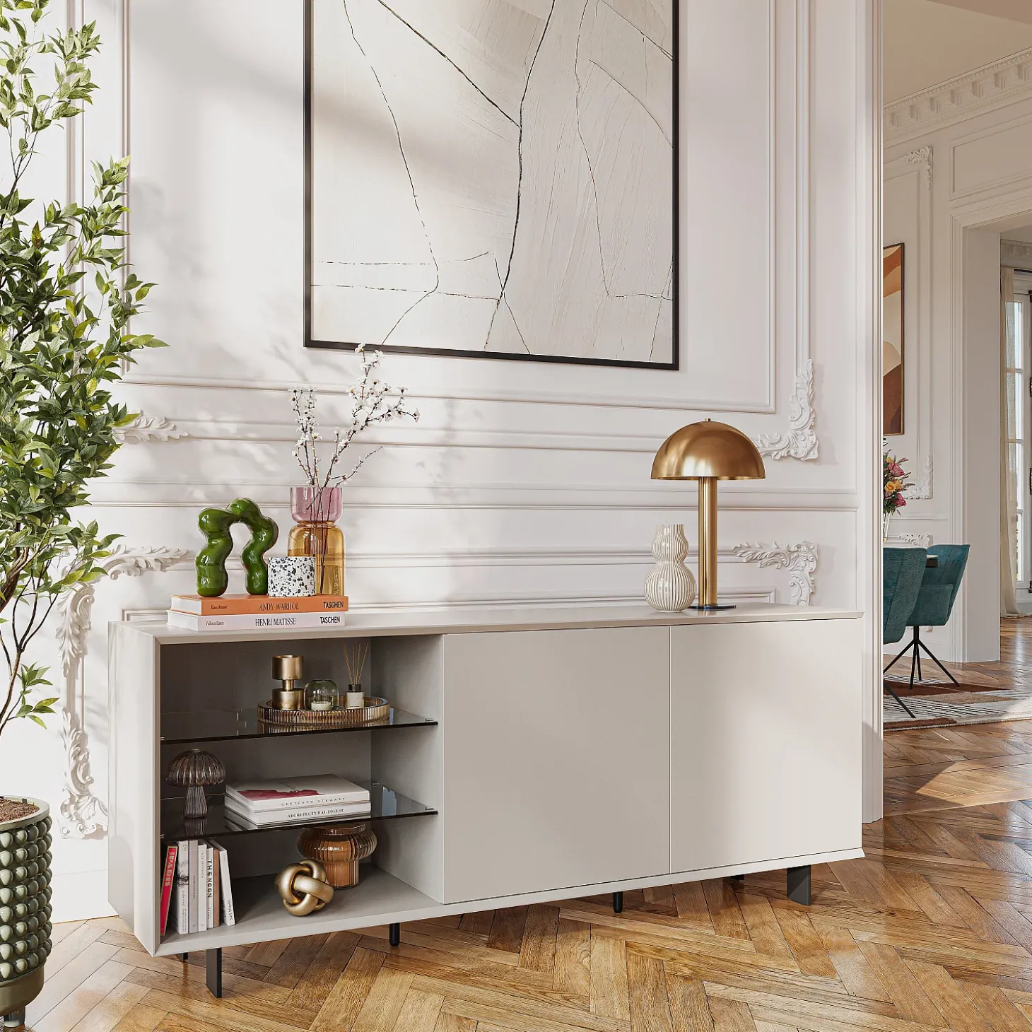 Rehaussé d’un piètement fin noir, le buffet adopte une finition crème mate, idéale pour accompagner des ambiances lumineuses et raffinées.