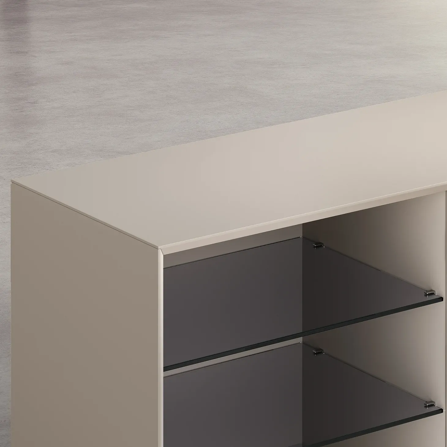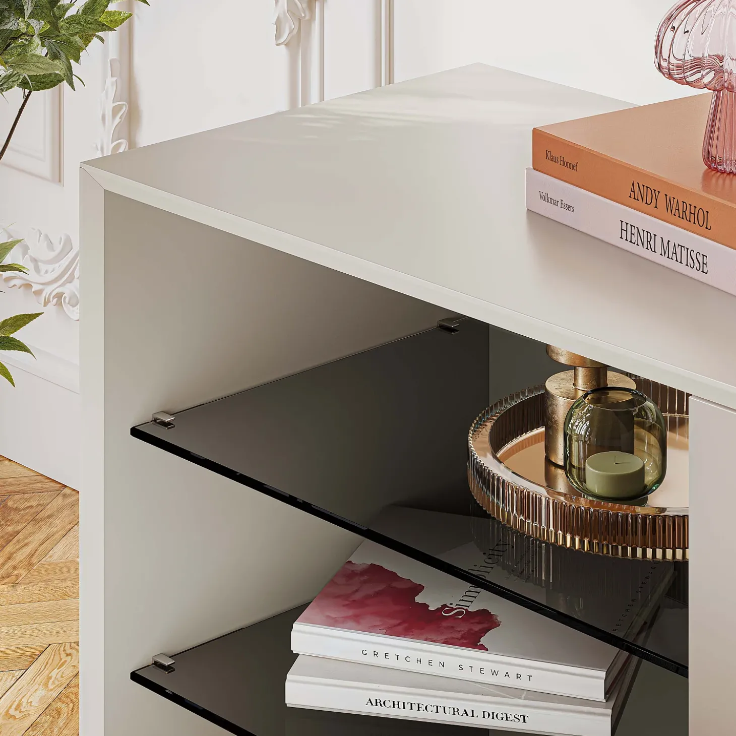 Équipé de deux portes dissimulant de multiples compartiments de rangement, il accueille aisément vaisselle, linge de maison ou objets du quotidien. Sur le côté, deux tablettes en verre trempé permettent de mettre en valeur des éléments décoratifs et de garder des accessoires essentiels à disposition.