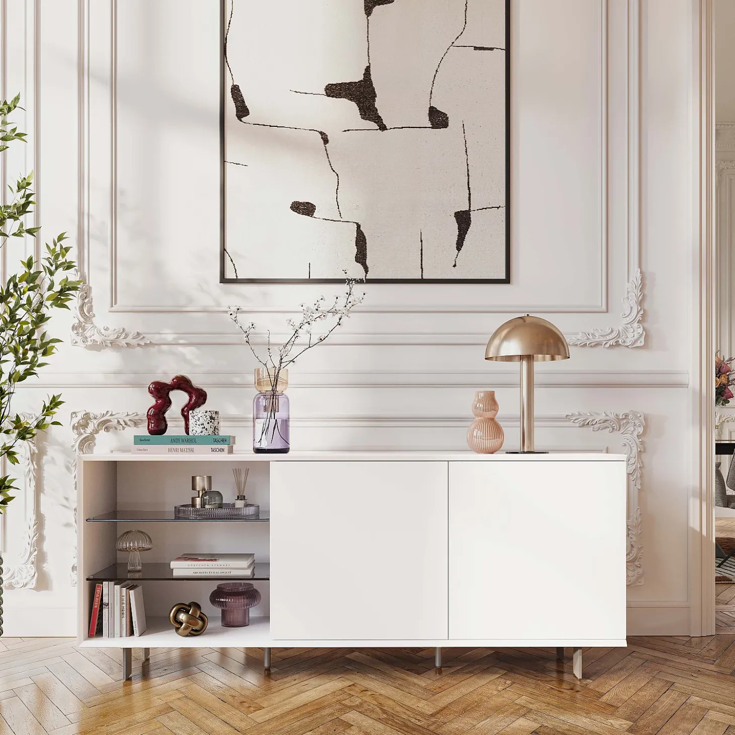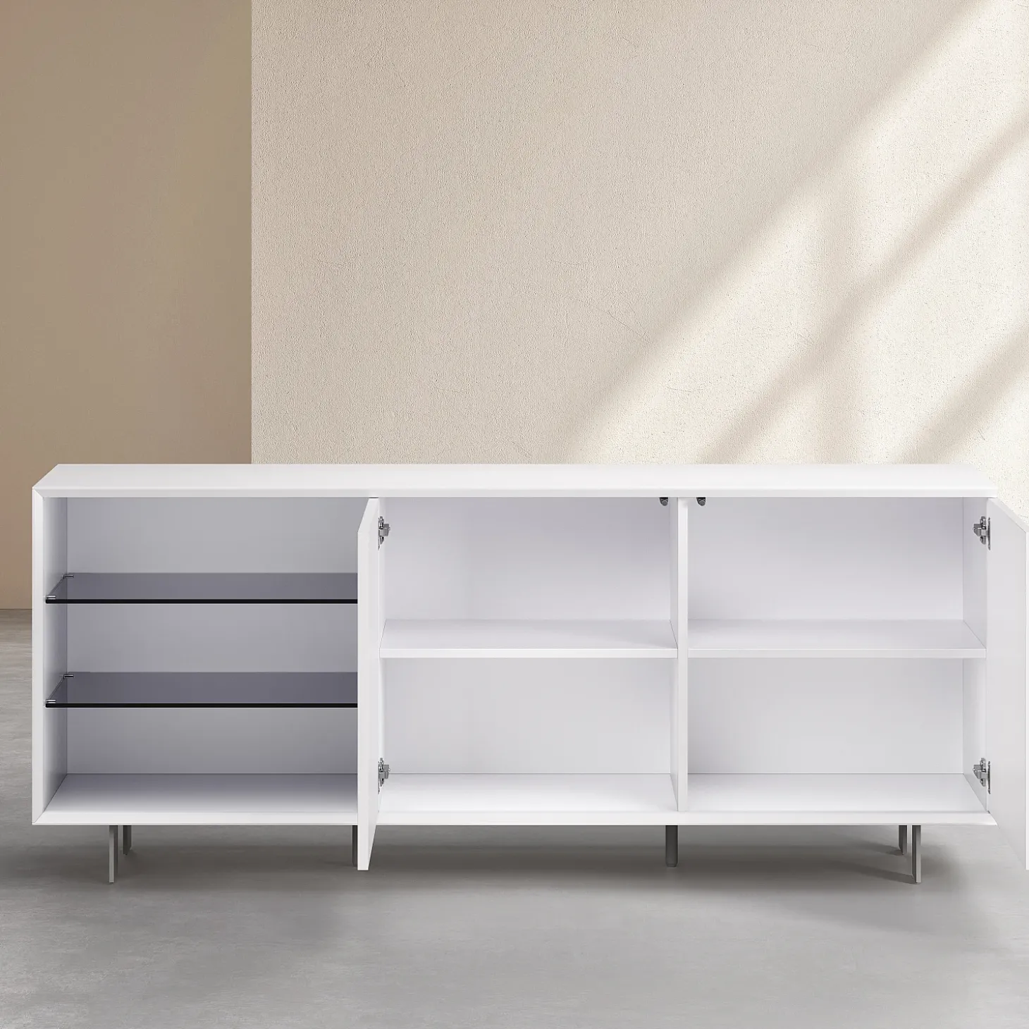 Rehaussé d’un piètement fin noir, le buffet adopte une finition blanche polaire mate au rendu soigné, idéale pour créer une ambiance lumineuse et minimaliste.