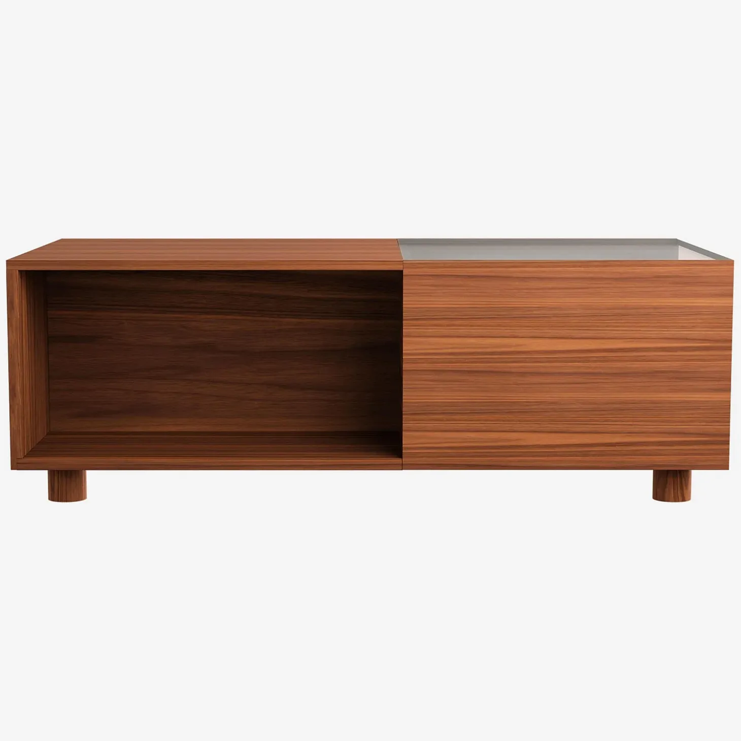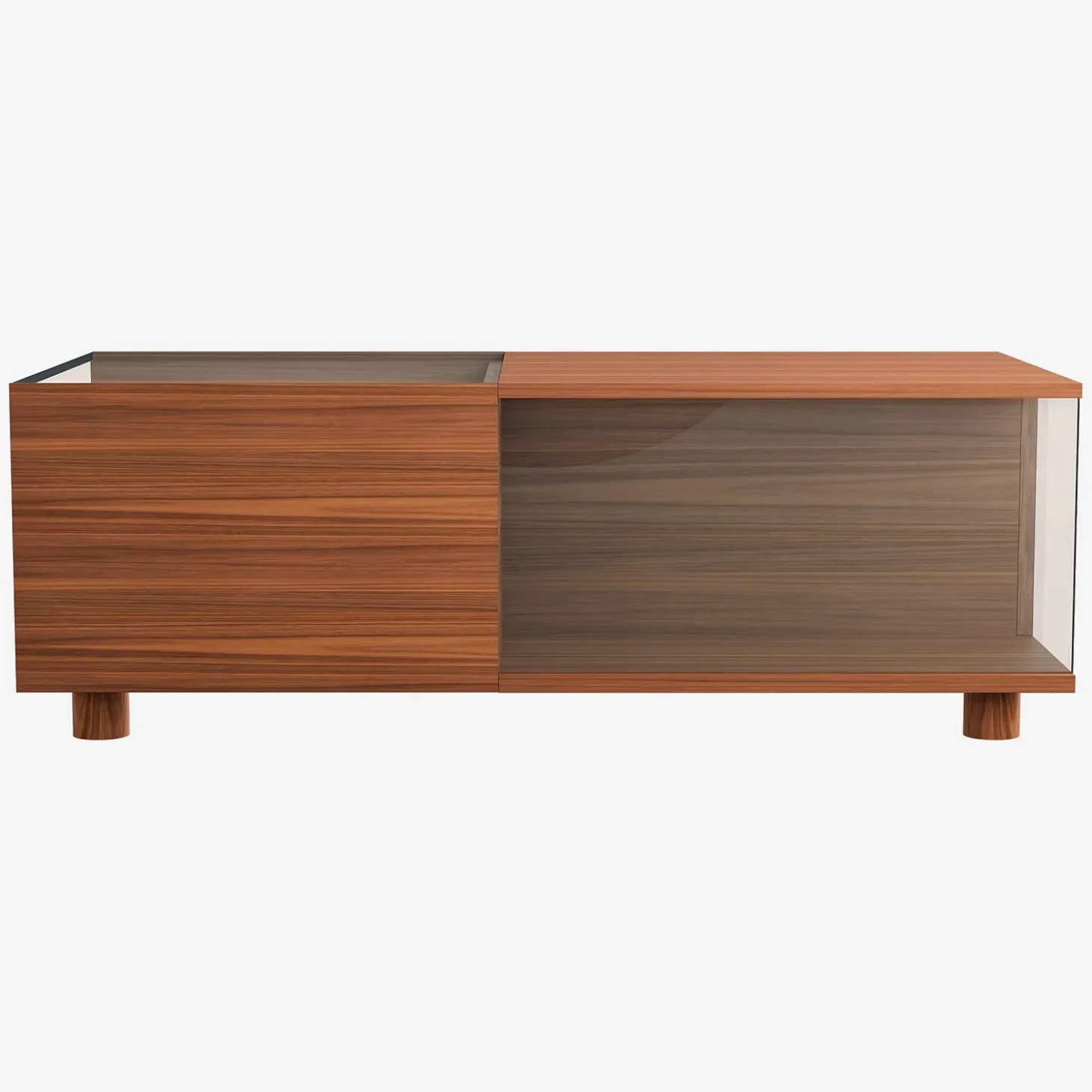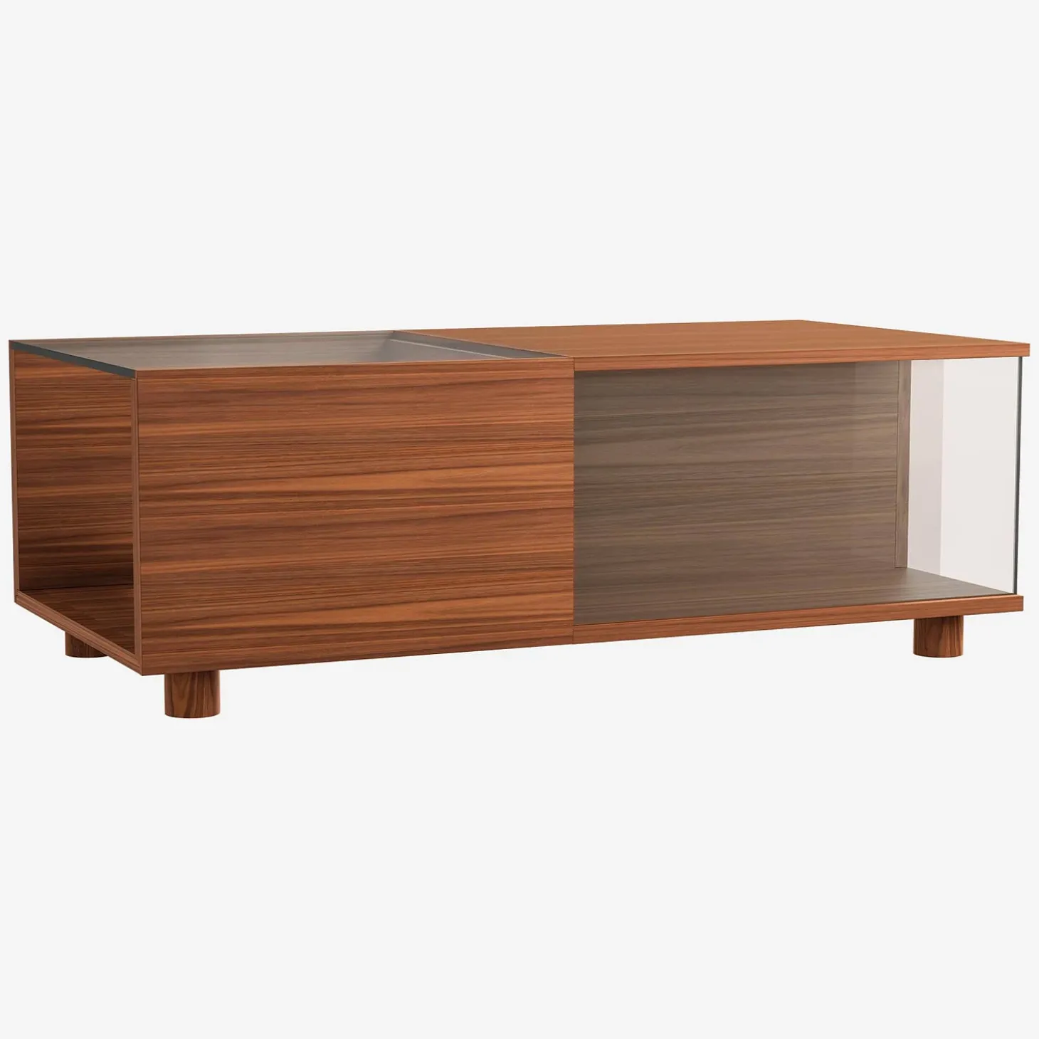**Fabriqué en Europe**Akiro associe la chaleur du noyer et la transparence du verre dans une table basse aérienne et graphique. Une pièce de design qui allie rangement discret et élégance contemporaine.