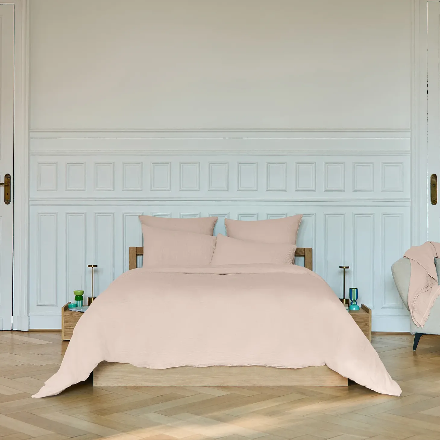 La housse de couette Arielle 240 x 220 cm en double gaze de coton rose poudré invite à la douceur et à la délicatesse.