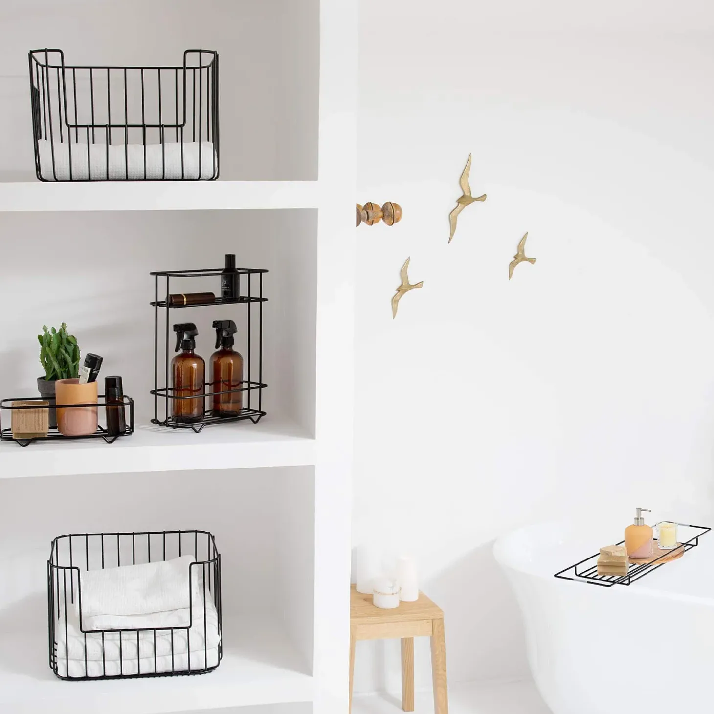 En métalAtela mise sur un design minimaliste et fonctionnel avec des paniers de bain en métal noir, robustes et modulables pour organiser vos espaces avec style.