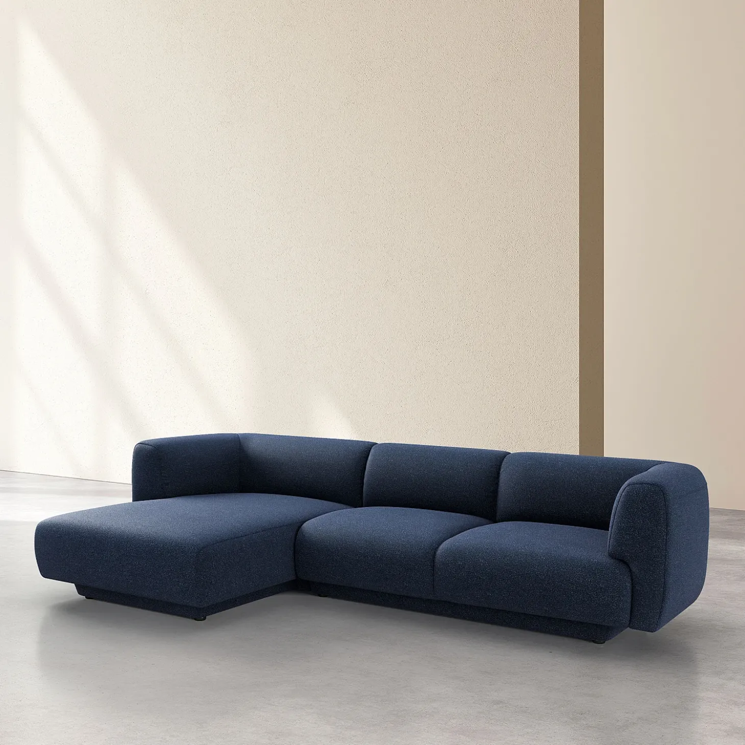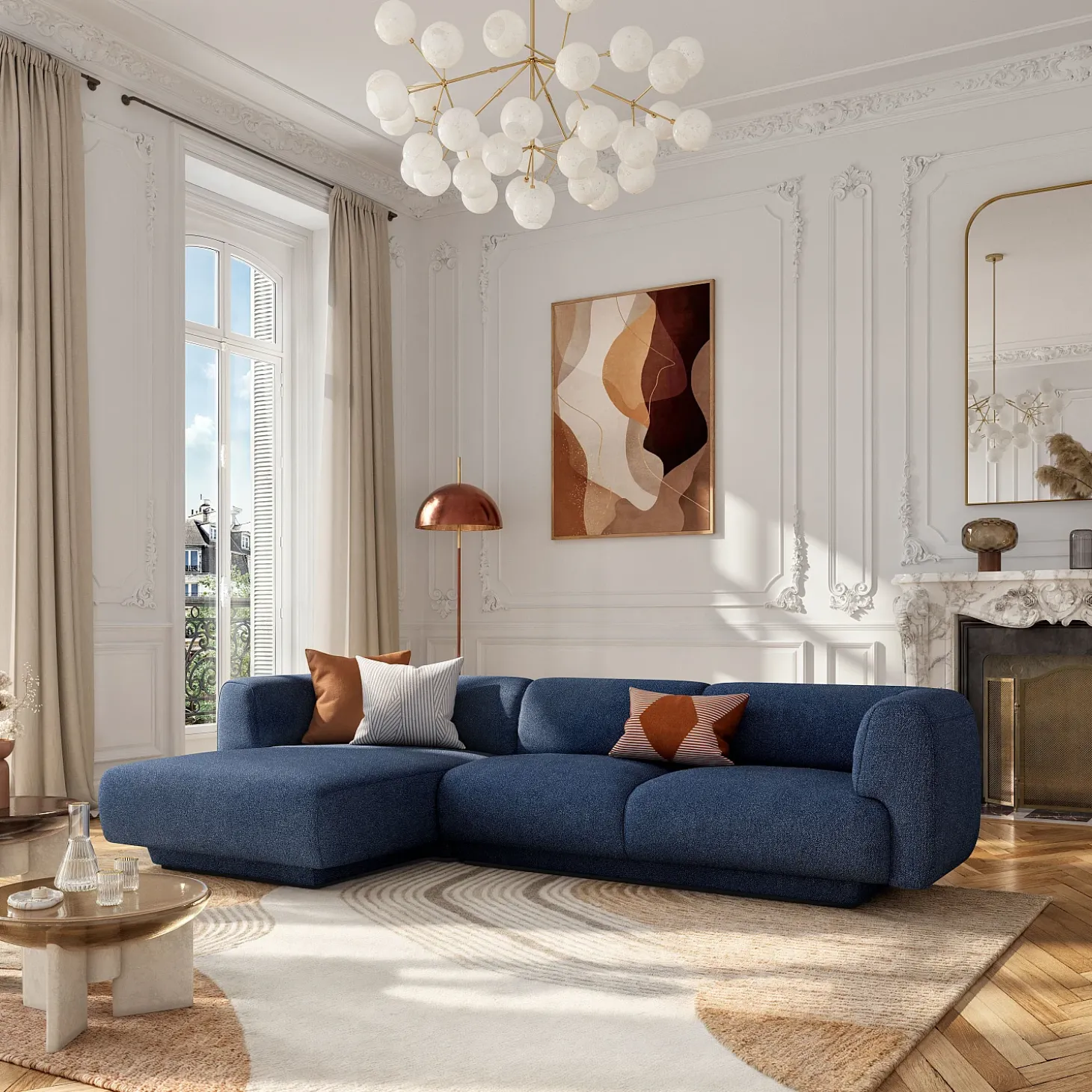 Conçu pour valoriser les espaces généreux, le grand canapé d’angle gauche Austin en tissu texturé bleu marine plonge la pièce dans une atmosphère chaleureuse. Son revêtement travaillé donne du relief à sa teinte profonde et sophistiquée.