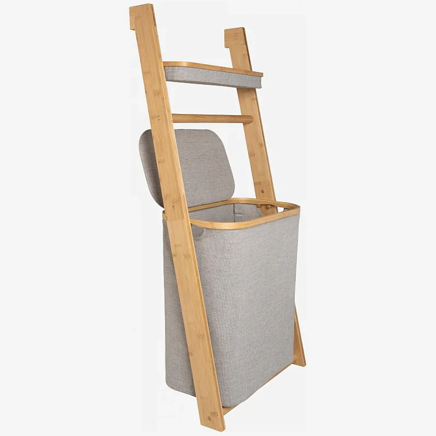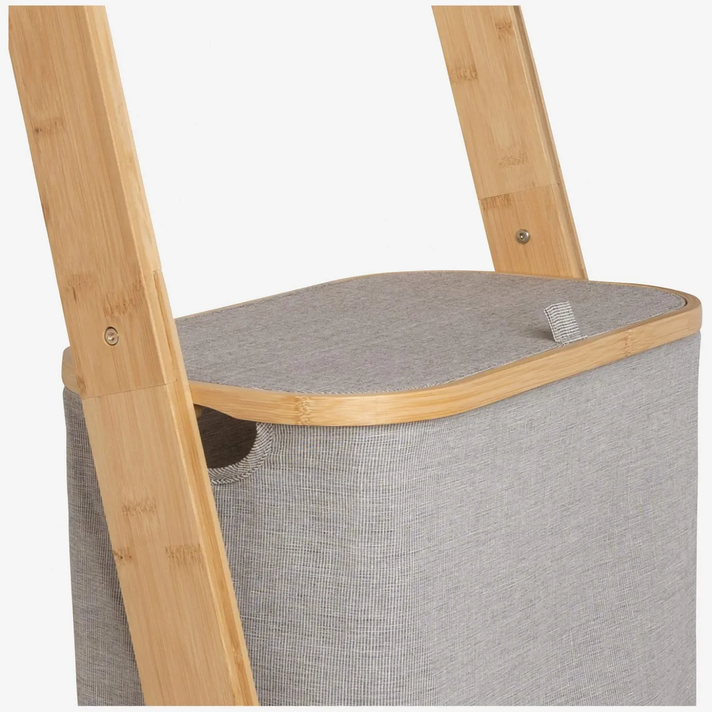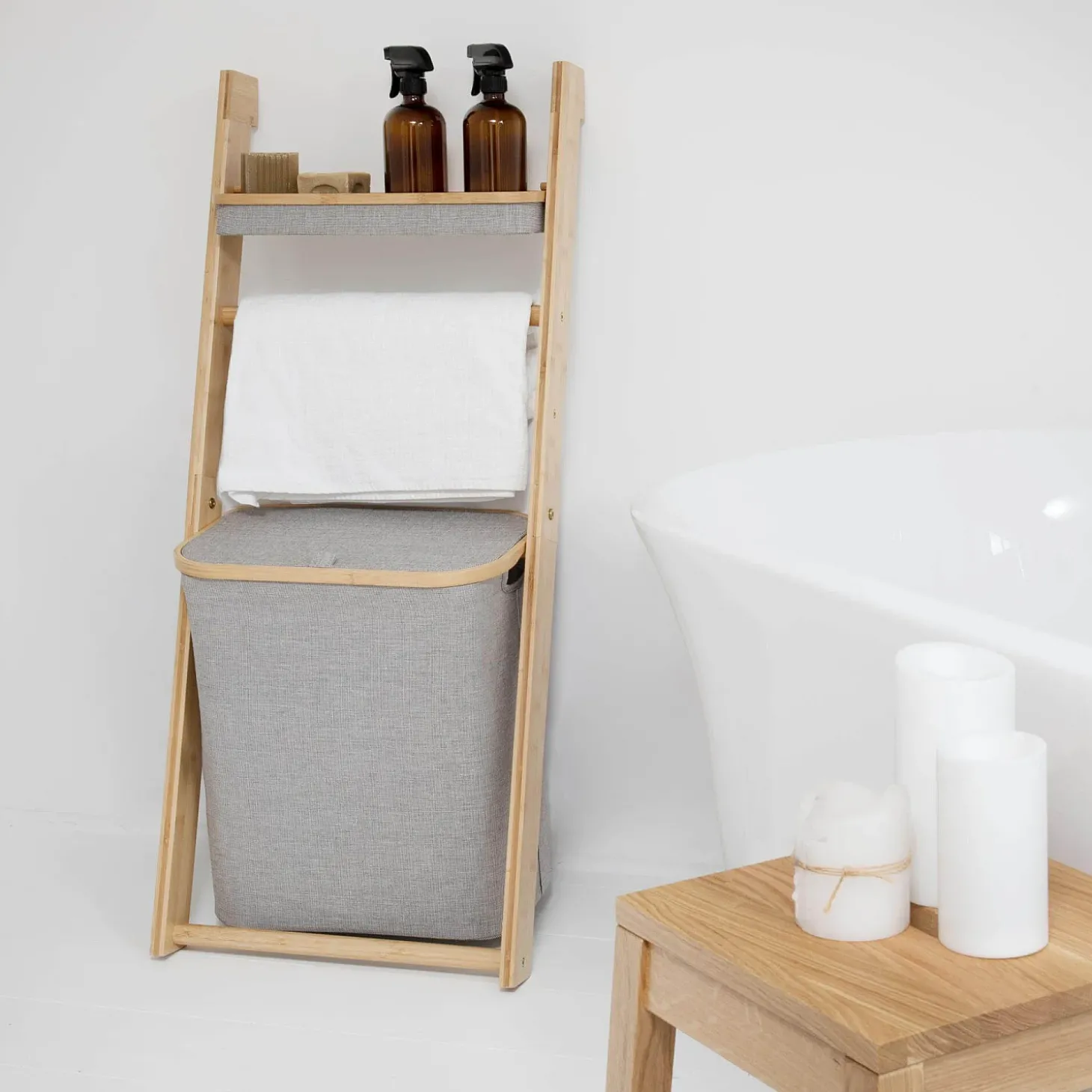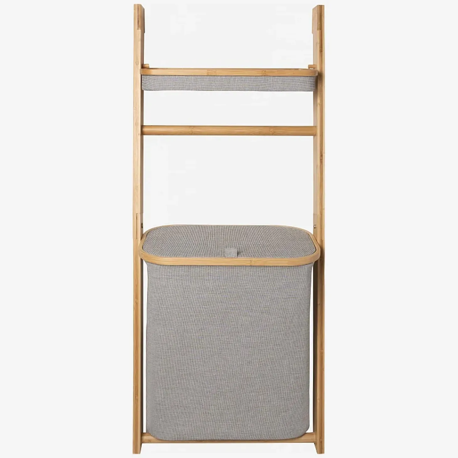 L’étagère de salle de bain Barnabé possède une structure en bambou ainsi qu’un grand panier à linge en tissu gris chiné. Conçue sur le principe d’une échelle, elle propose une barre de suspension pour le séchage d’une serviette de toilette par exemple et dispose dispose aussi d’une tablette supérieure pour accueillir toutes sortes d’objets.