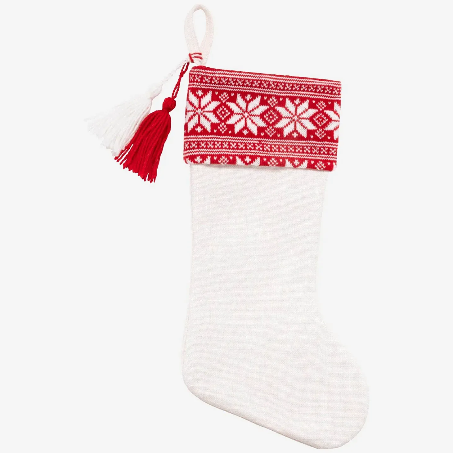 La chaussette tricotée Barou blanche et rouge, vendue par lot de 12, décore les espaces à Noël avec vivacité pour passer des fêtes dans un univers chaleureux.