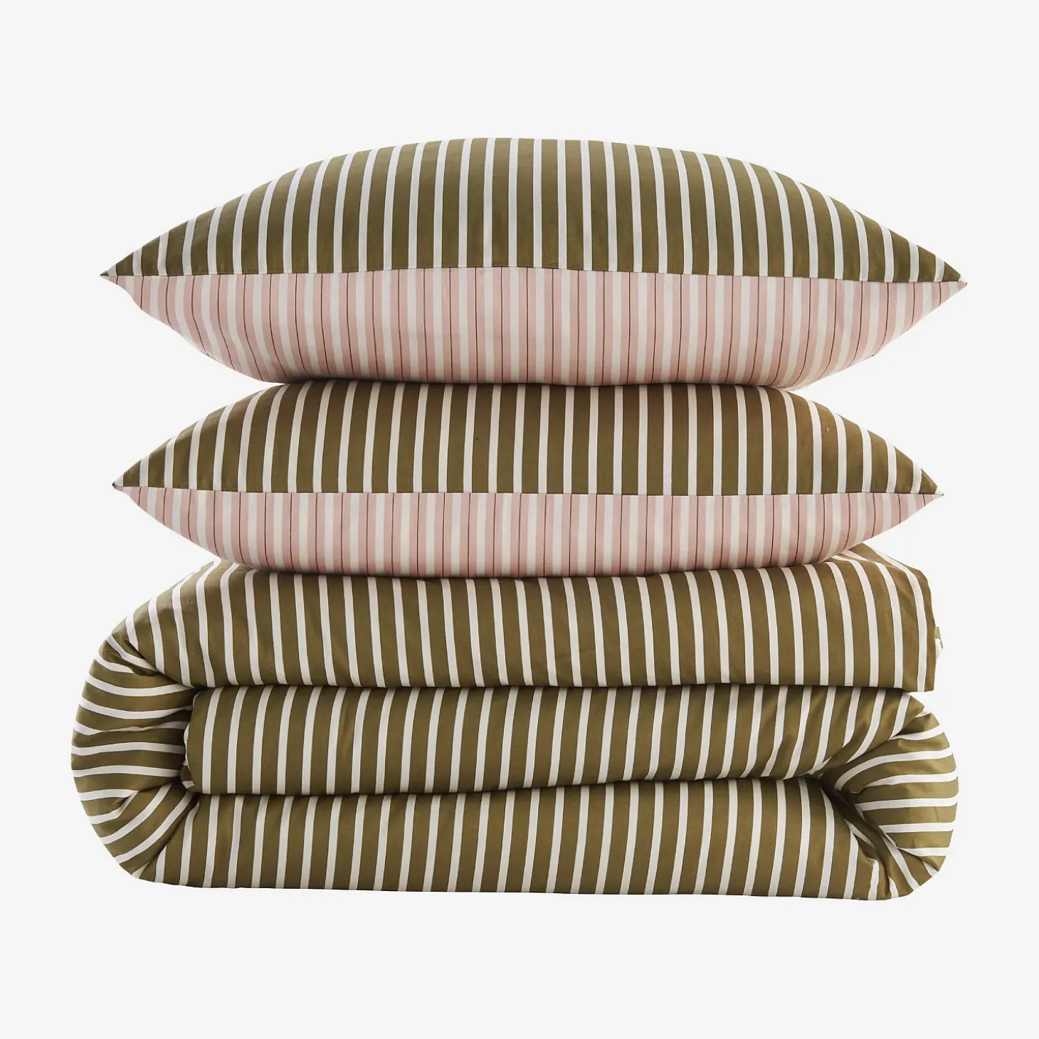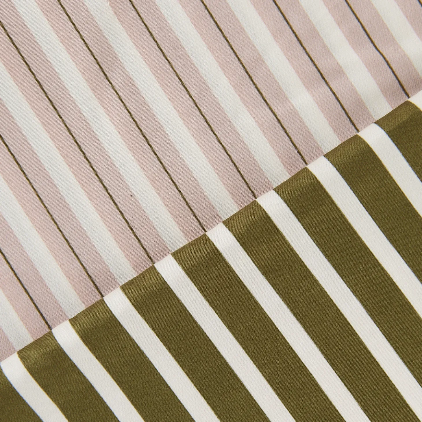 Sur le recto, les rayures vertes et écrues se déploient avec élégance, créant une harmonie visuelle à la fois moderne et apaisante. Au verso, le rose et l’écru s’entrelacent délicatement, apportant une touche de chaleur et de sérénité.