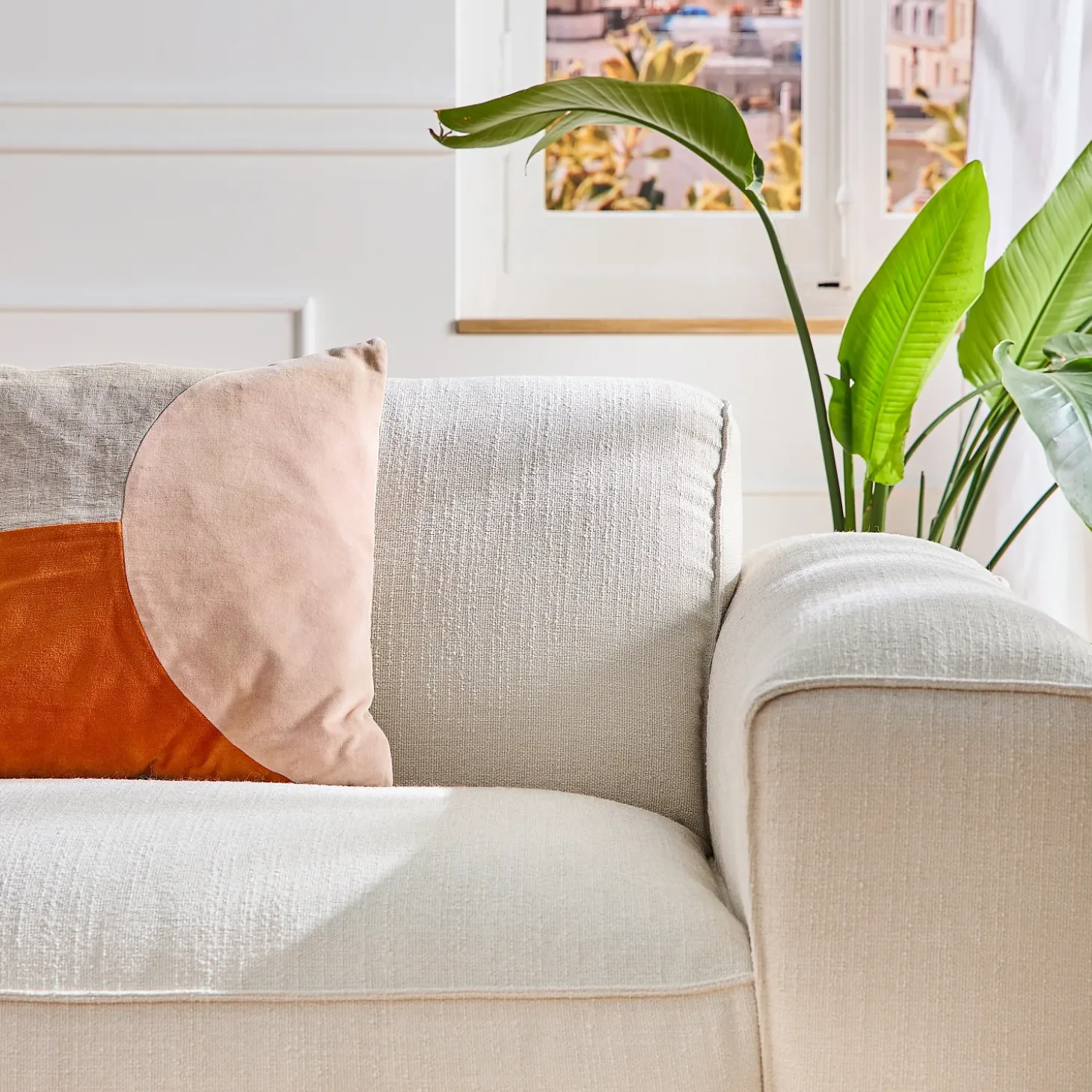 Les teintes soigneusement choisies, orange vibrant, rose pâle poudré et écru naturel, s’entrelacent avec légèreté, apportant à l’ensemble une élégance moderne et chaleureuse.