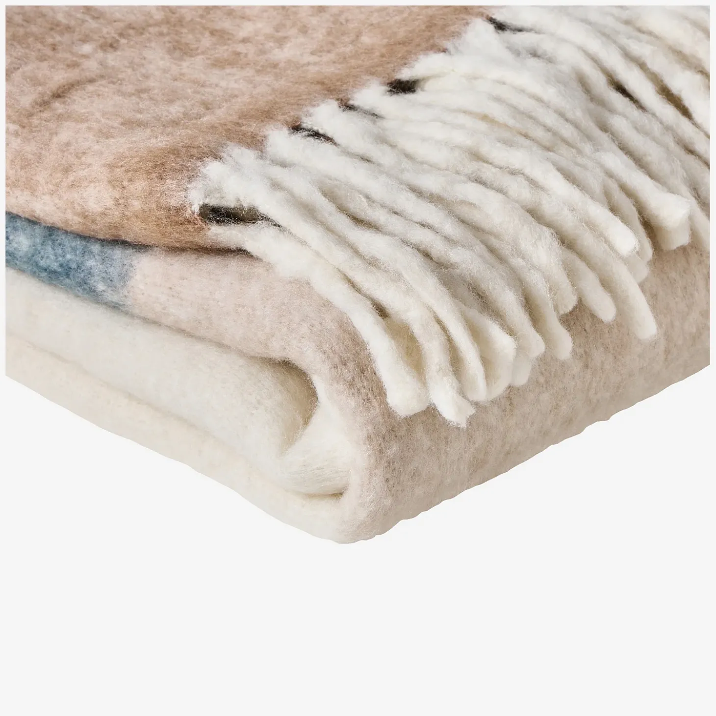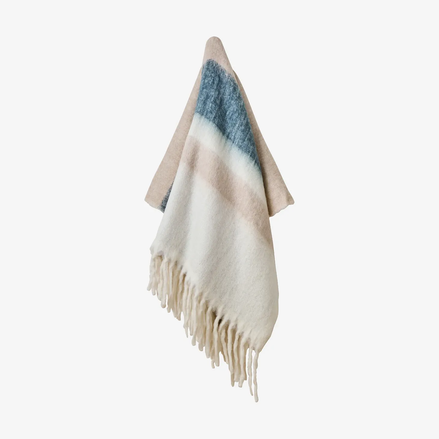 Le plaid Bruna se dévoile dans un doux mariage de teintes écru, bleu sarcelle et beige, où les rayures, floues et légèrement fondues, s’entrelacent dans un délicat jeu de dégradés.