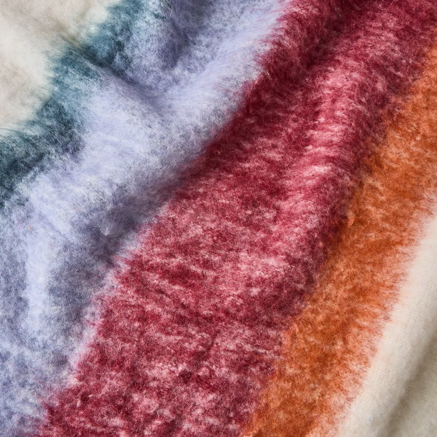26% laine, 63% acrylique, 11% NylonRayures fondues et nuances colorées s’entremêlent pour créer un plaid tout en douceur, où l’on souhaite se blottir chaleureusement.