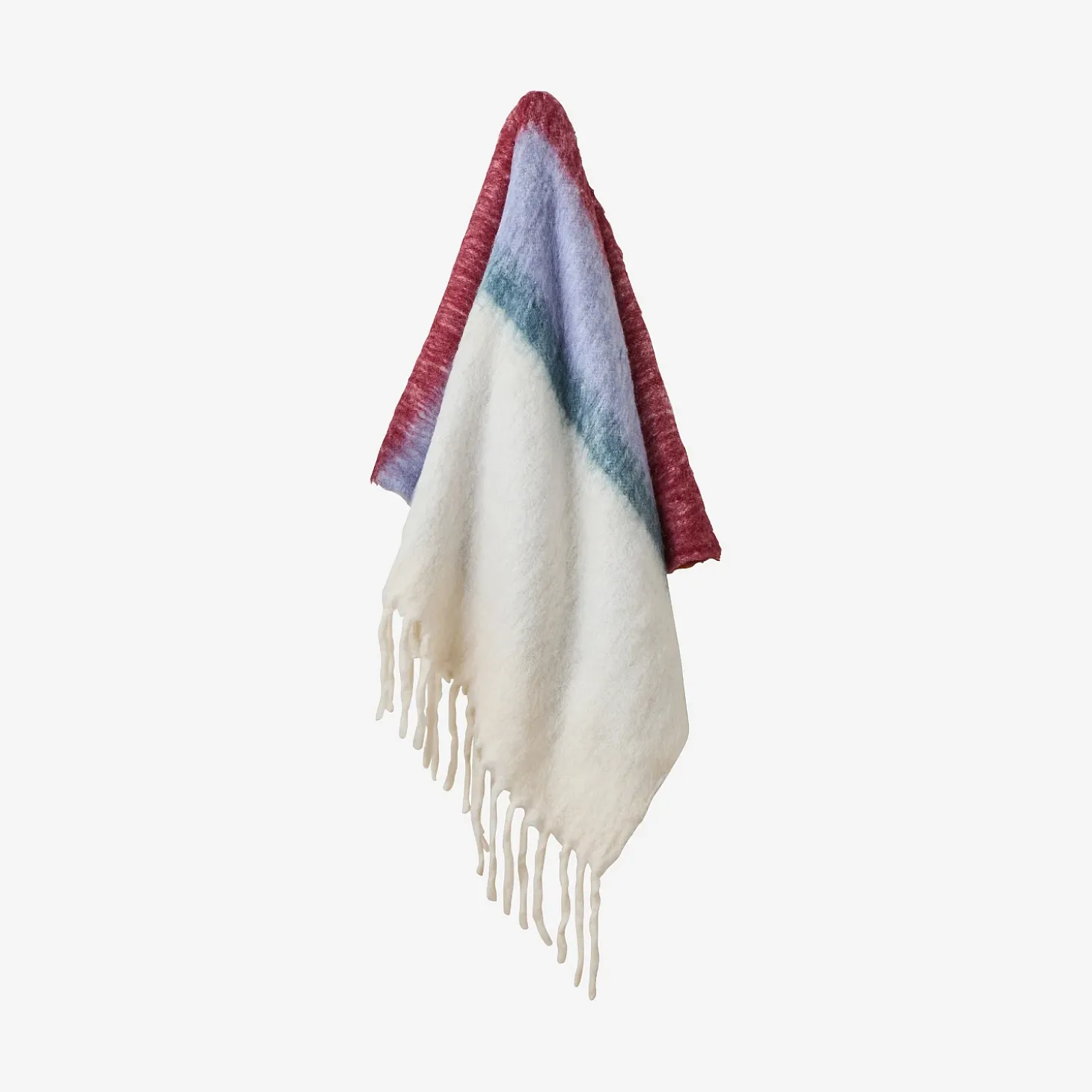 Dans une composition envoûtante d’écru, bordeaux et lilas, le plaid Bruna joue sur l’harmonie des couleurs dégradées, où les rayures, doucement estompées, se fondent et se superposent comme une brume matinale.