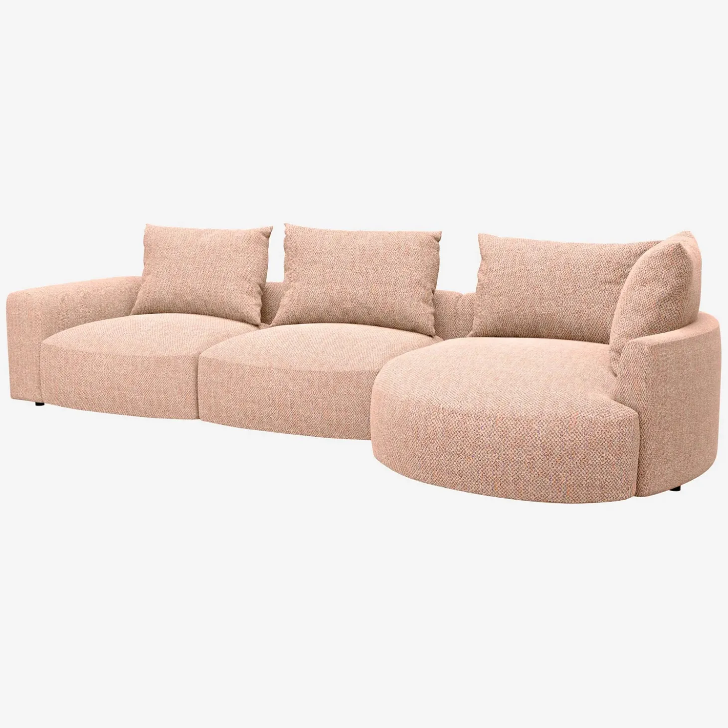 Le canapé d’angle droit Cagliari en tissu Bellagio orange aurore se compose de deux blocs : un droit et une méridienne de forme organique. Sa profondeur d’assise de 60 cm est une invitation au cocooning. Ses coussins de dossier sont en plumes et mousse pour vous offrir un moelleux confortable et relaxant. Ce canapé existe également dans une version <dynamiclink target=