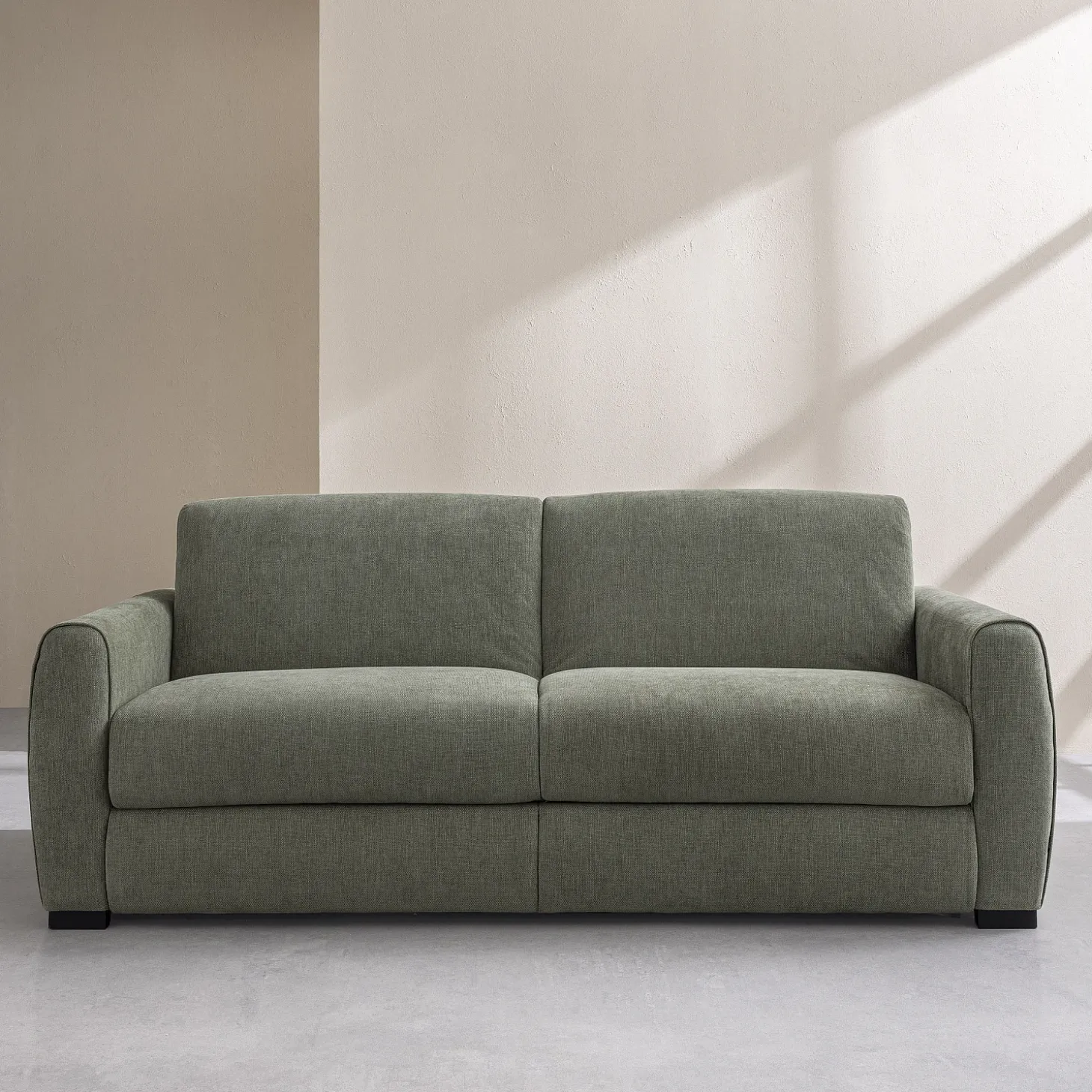 Le canapé convertible 3 places Canberra est habillé d’un tissu Lugano chenillé doux, décliné dans un vert olive élégant et naturel. Allié pratique pour un usage serein, ce revêtement déperlant garantit une protection efficace contre les éclaboussures.
