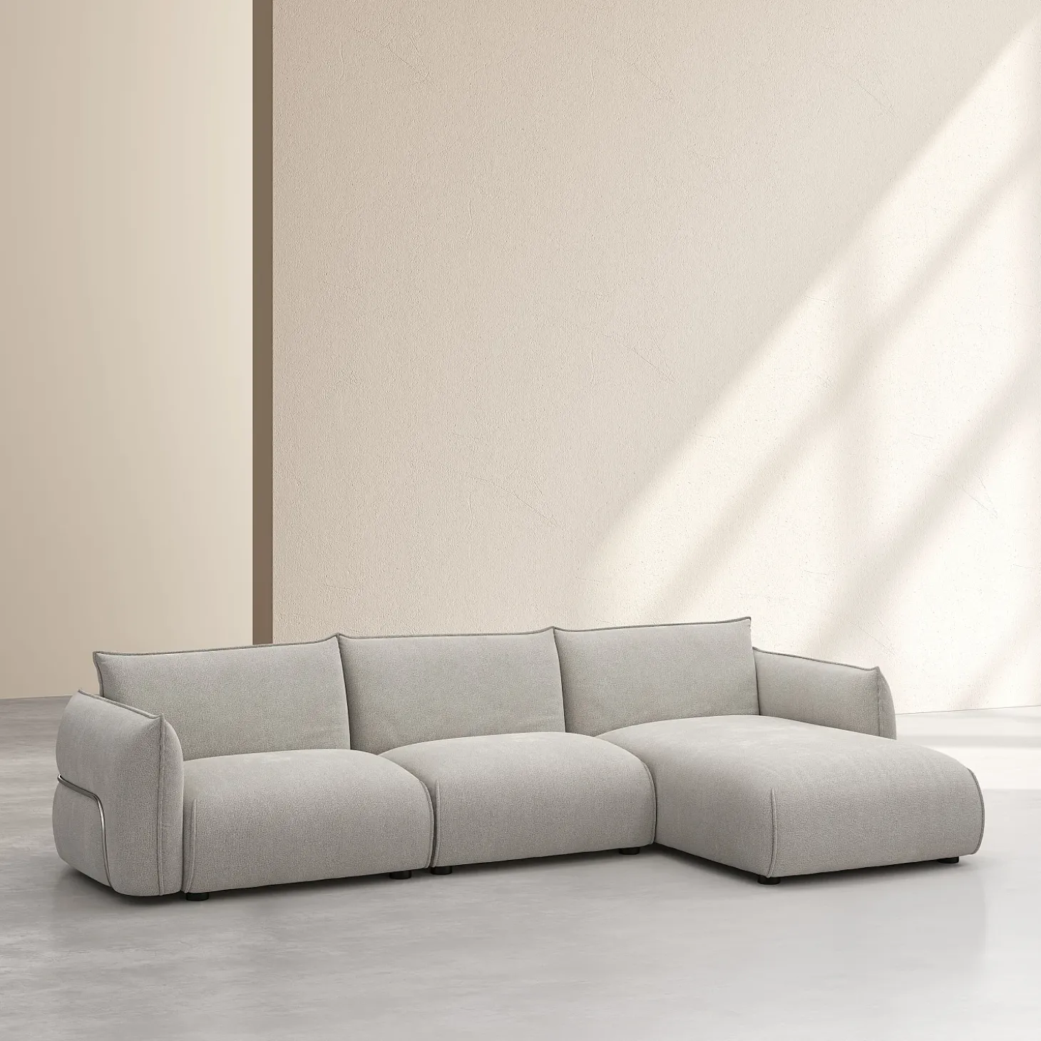 Le canapé d’angle droit Celeste en tissu gris perle apporte un subtil mélange d’élégance et de modernité. Son coloris discret crée une ambiance intemporelle apaisante.