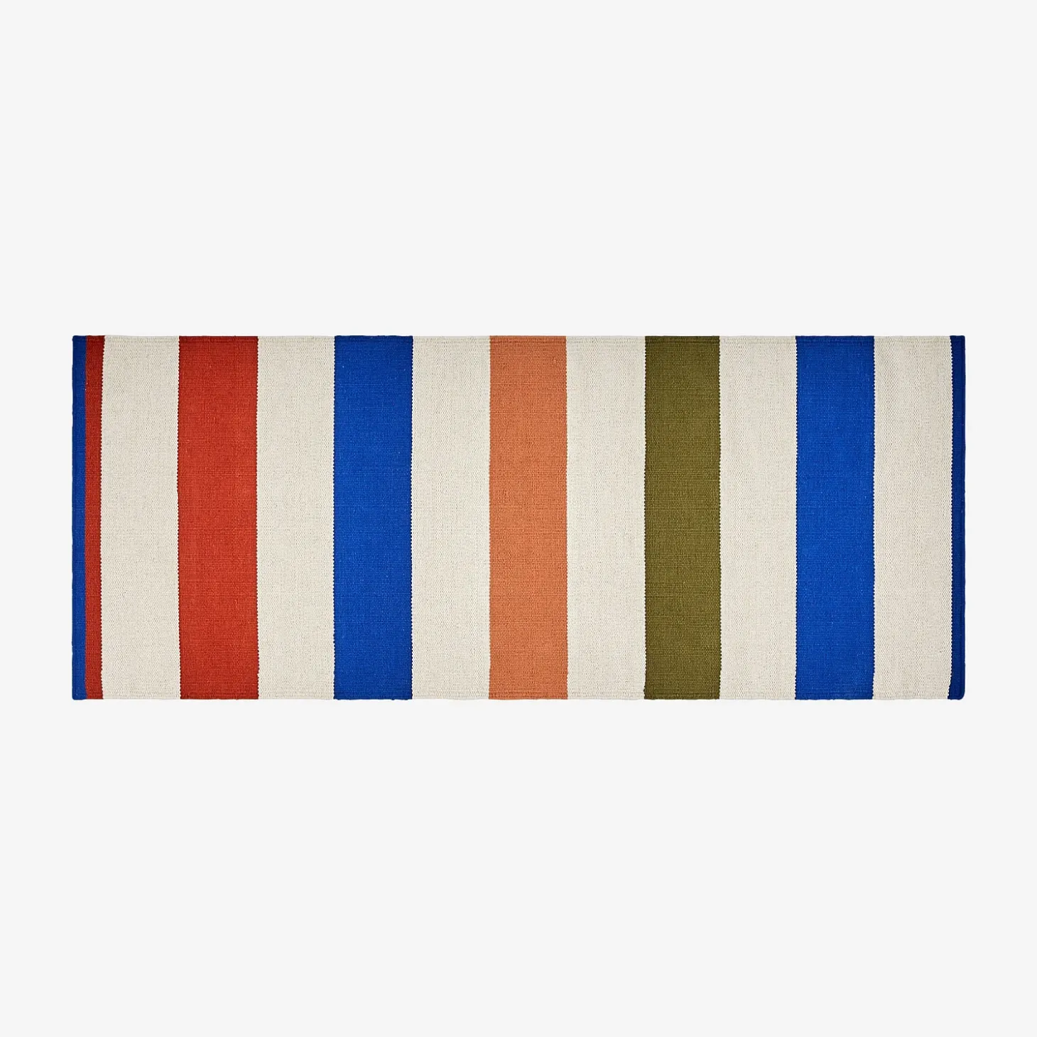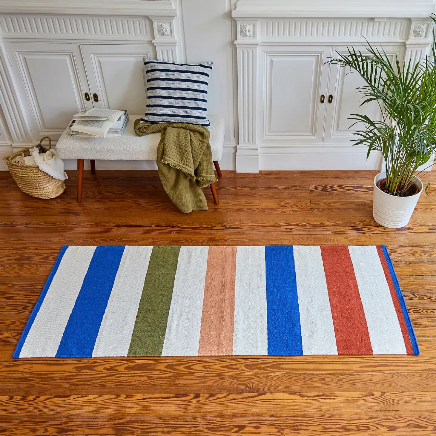 Le tapis Claudie en coton, avec ses larges rayures bleu électrique, apporte une énergie moderne et rafraîchissante aux intérieurs.