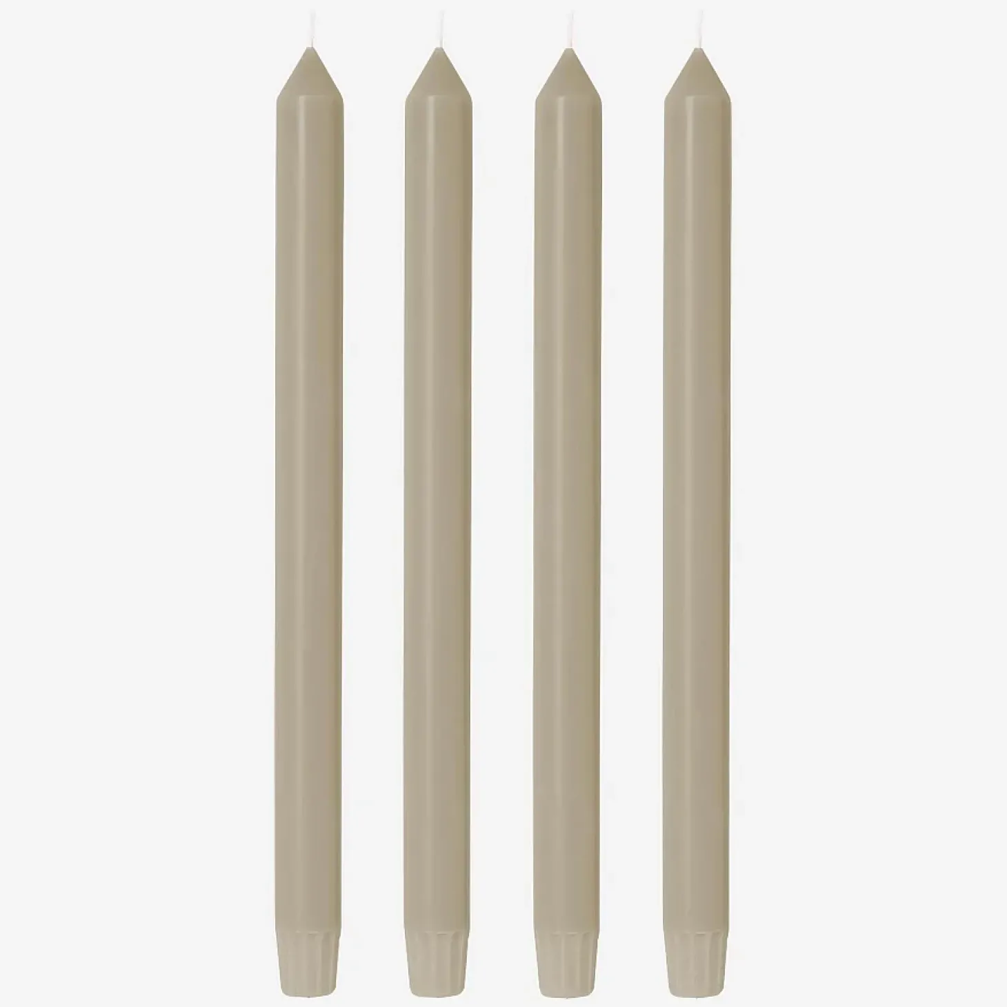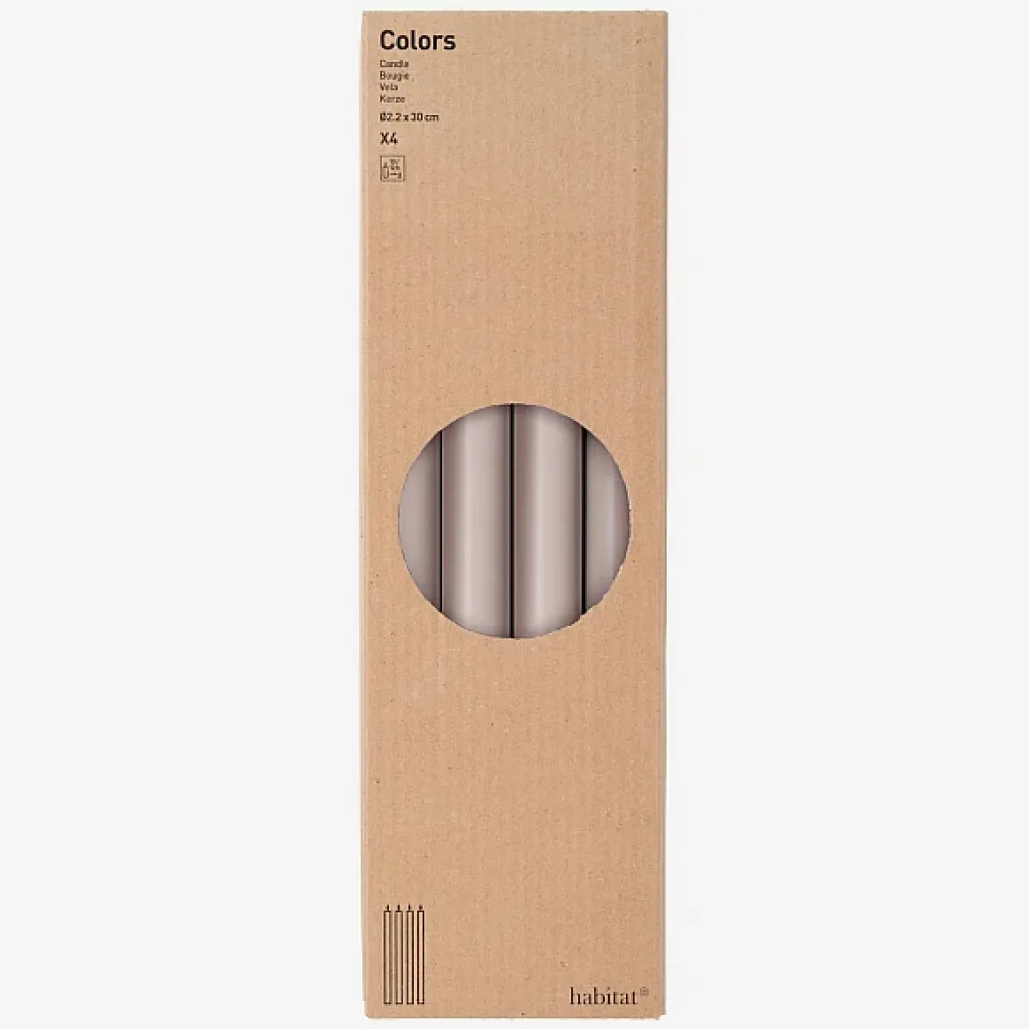 Les bougies cierges Colors de couleur taupe font 30 cm de hauteur. Elles sont disponibles en lot de 4.