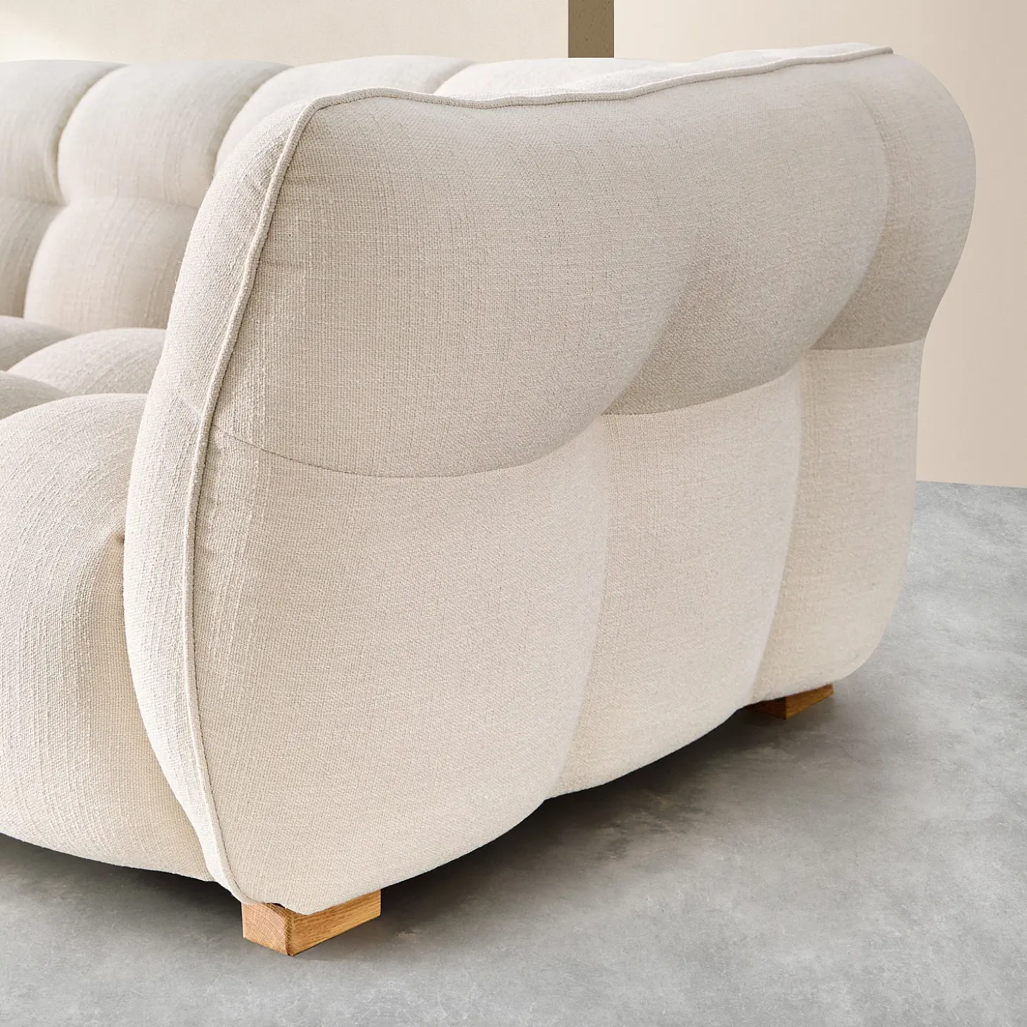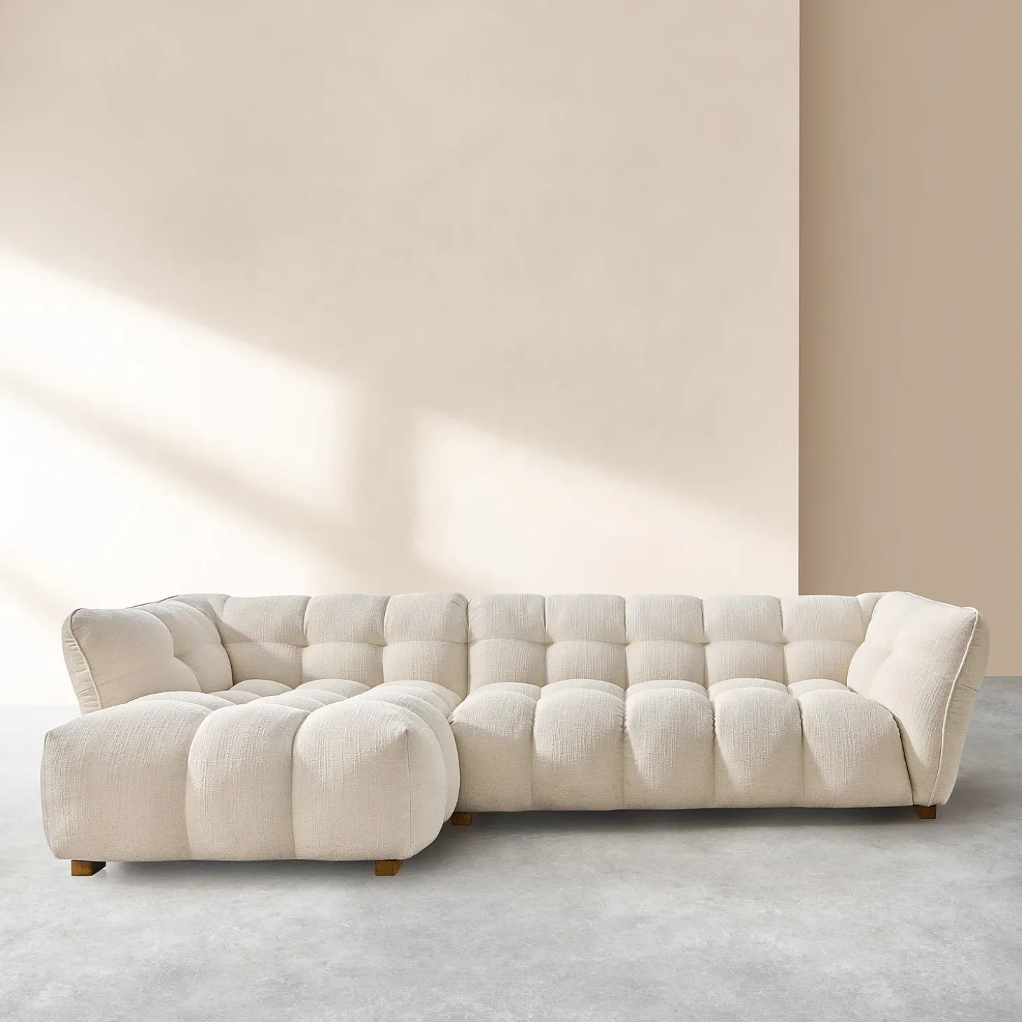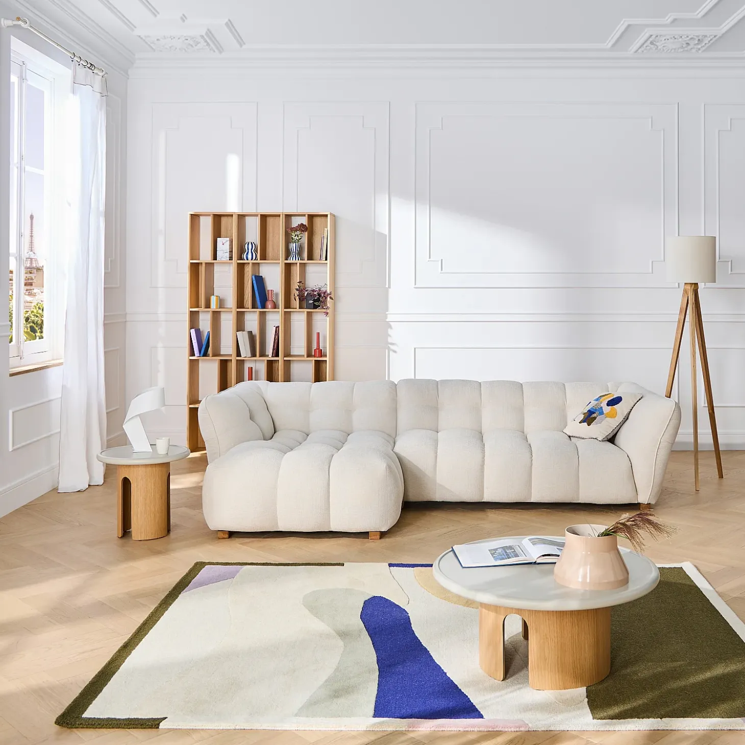 Le canapé d’angle gauche Dalvi est sublimé par un tissu en bouclette courte Mira couleur ivoire, qui souligne ses formes rebondies et son allure singulière.