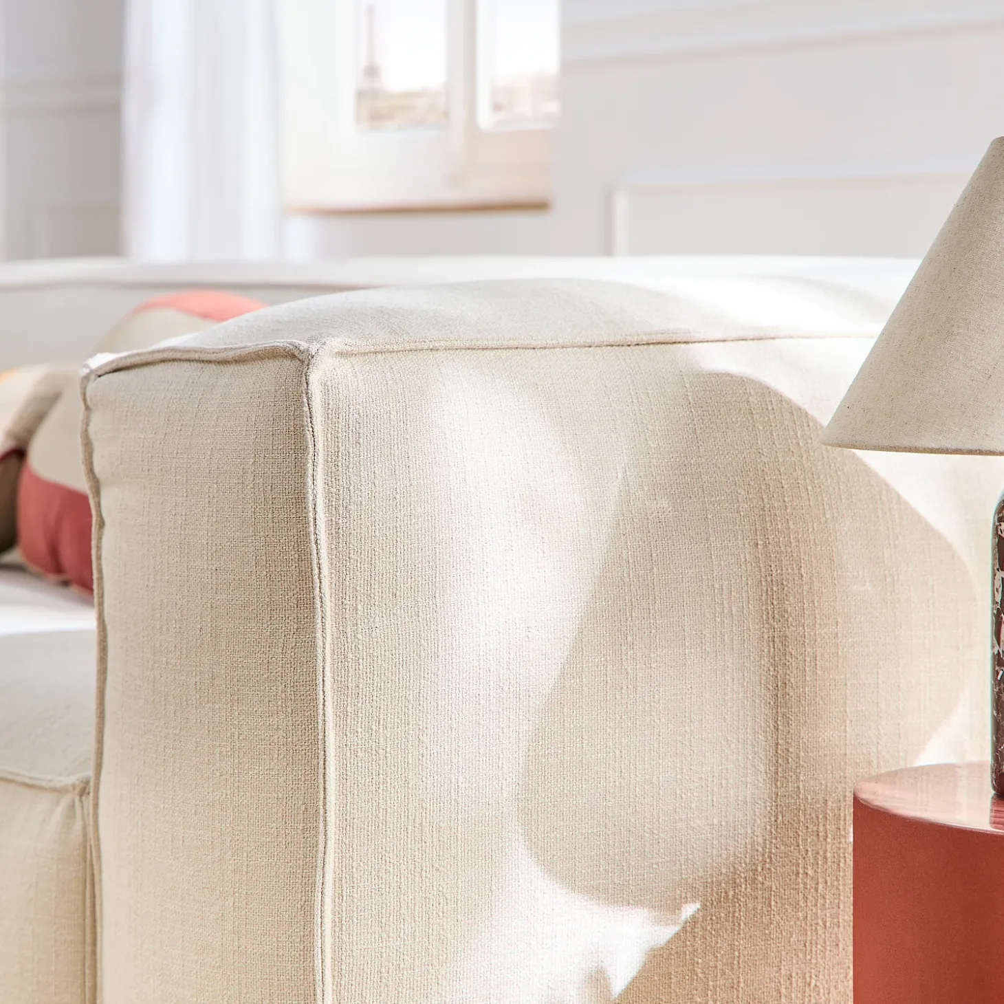 Le canapé 4 places Edwin s’habille d’un tissu Mira en bouclette courte. Ce revêtement tendance offre un toucher texturé chaleureux et sensoriel. Sa déclinaison en coloris ivoire reflète la lumière, et prend subtilement place au coeur du foyer avec élégance et douceur.