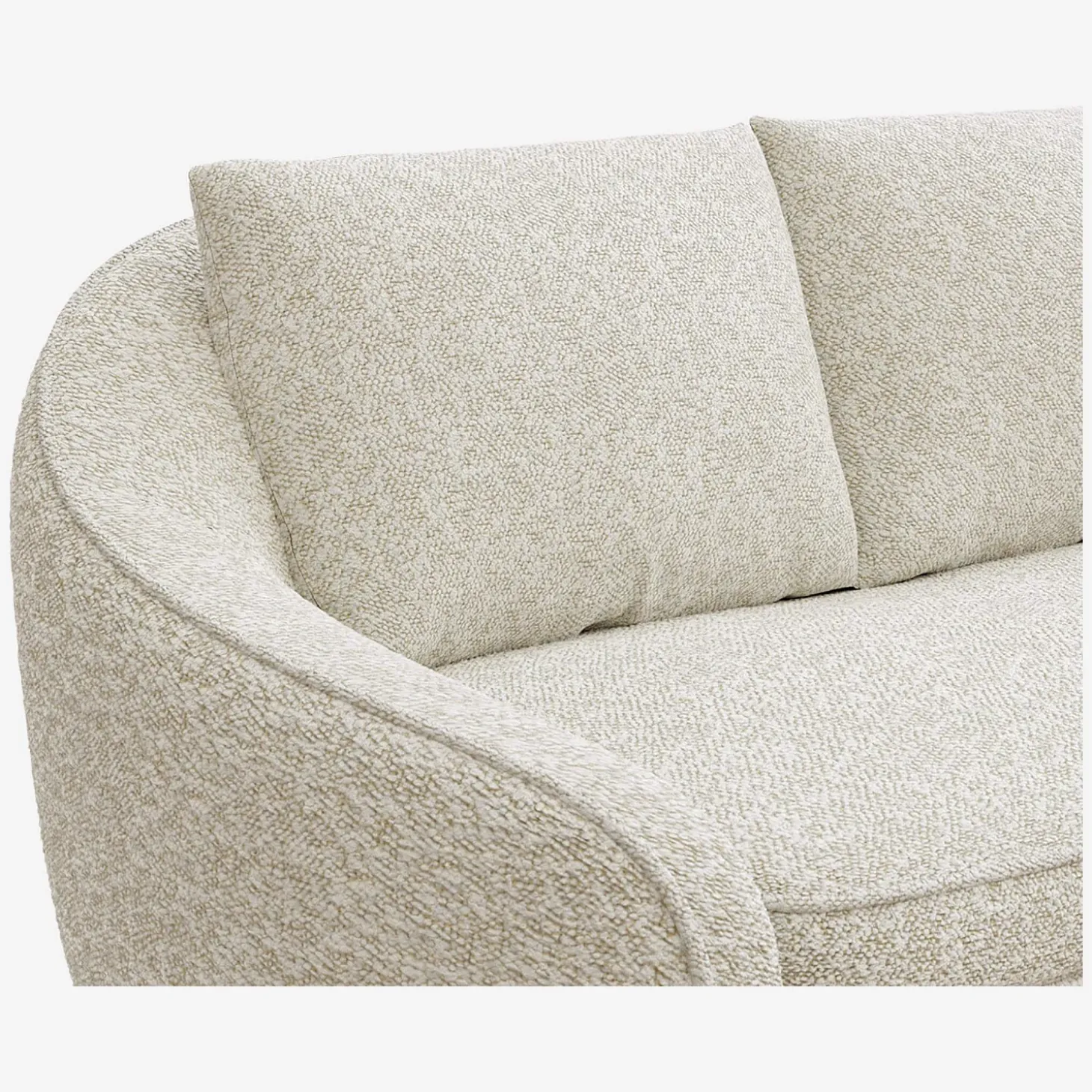Cette assise tire son élégance de son revêtement de couleur beige à la finition bouclette et au toucher texturé. Son dossier et ses accoudoirs arrondis lui confèrent son côté enveloppant, très cosy. Aussi beau de face que de dos, il s’installe avantageusement au centre d’une pièce.