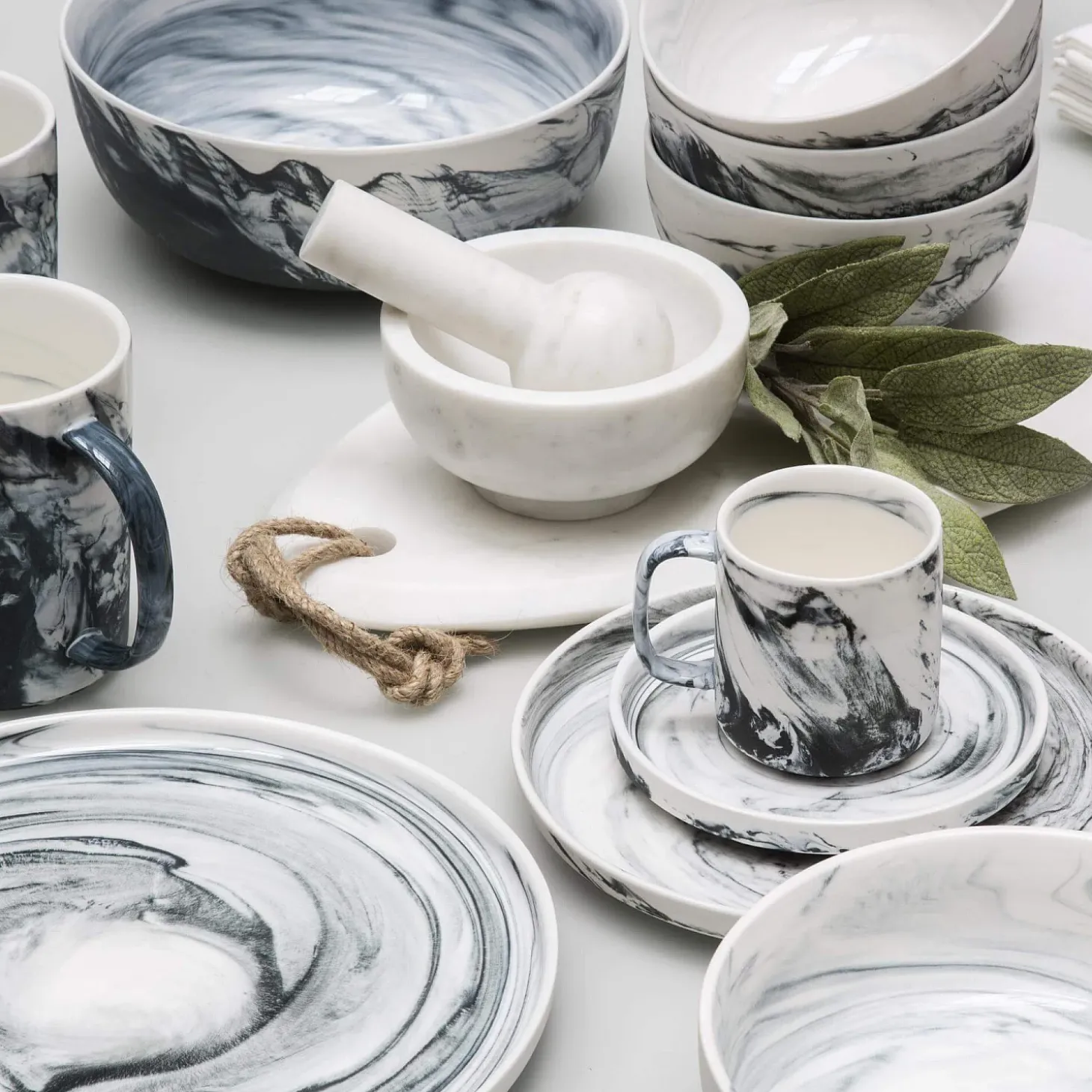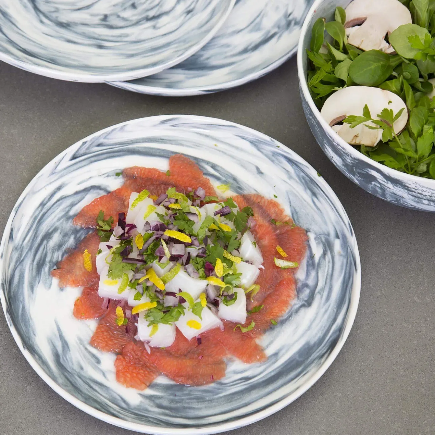 La gamme de vaisselle Esbo en porcelaine est le résultat d’un processus de fabrication original où chaque pièce est unique. Mélange de deux argiles qui, sous l’effet de la chaleur, dévoile un effet marbré gris. L’extérieur est mat pour un rendu naturel qui contraste élégamment avec l’intérieur vernis brillant (permettant le contact alimentaire). Ce service se décline de l’assiette à la tasse à café.
