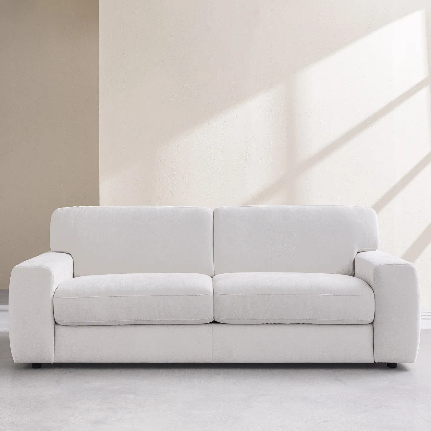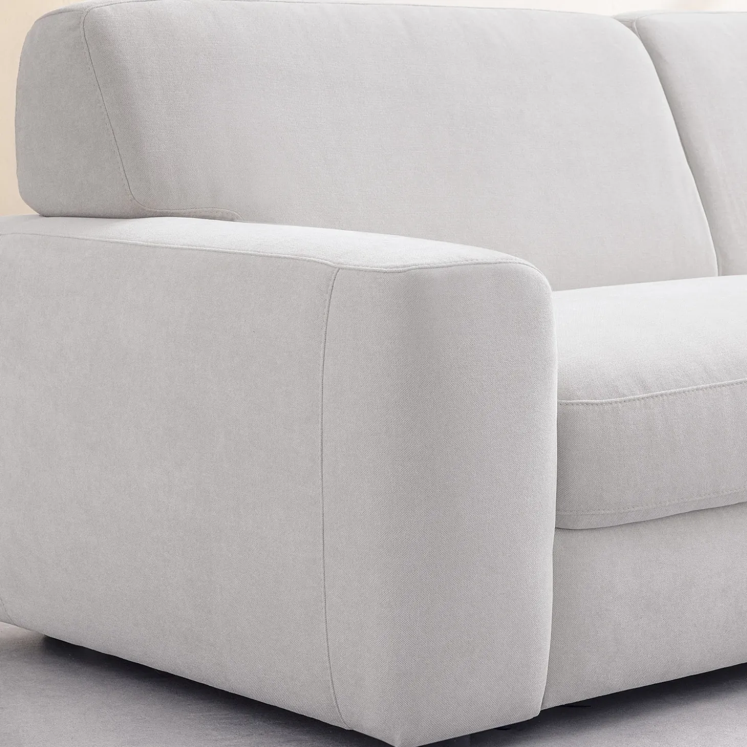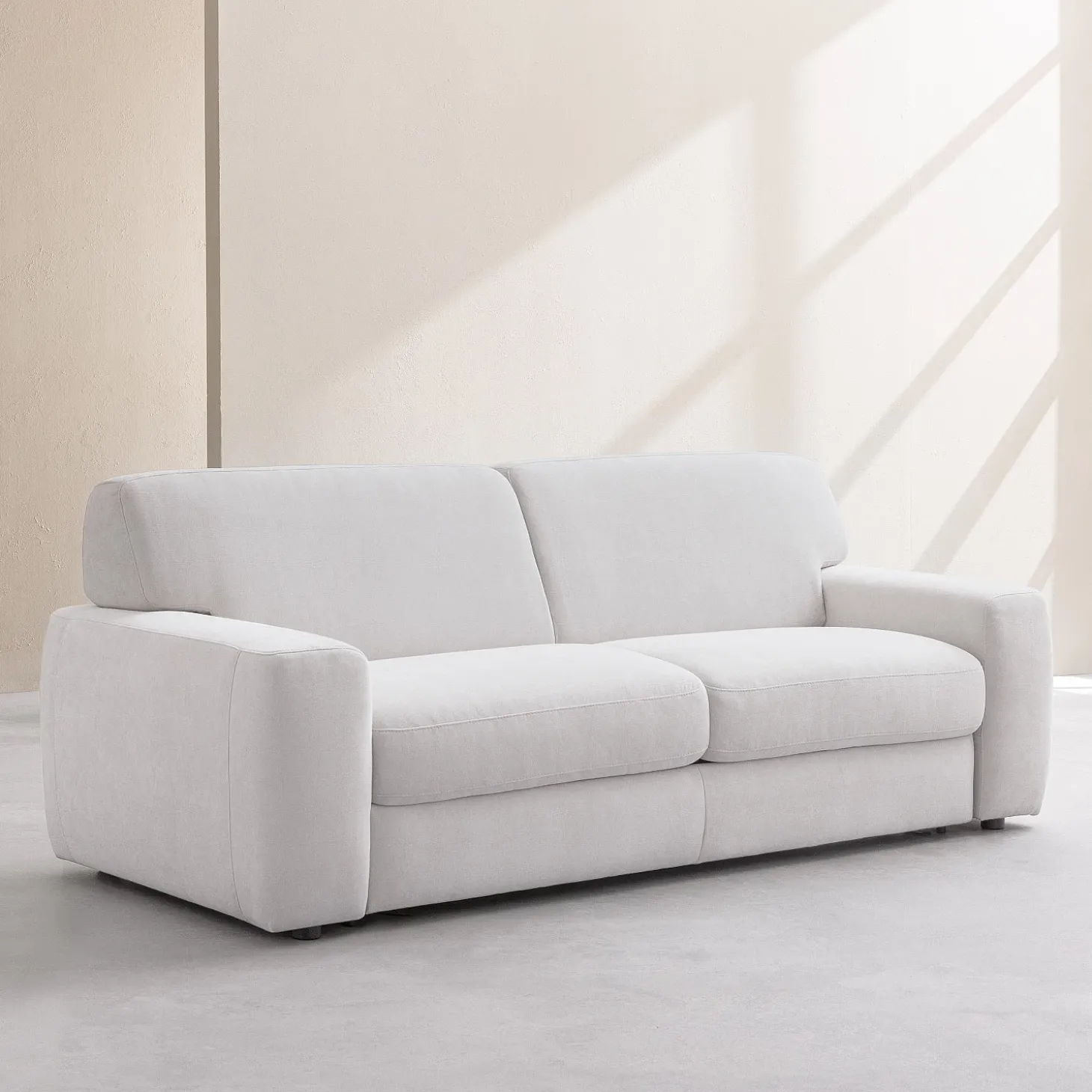 Le canapé convertible 3 places Faro s’habille d’un tissu Atrani, un textile doux à la teinte crème lumineuse. Ce revêtement offre un entretien facilité grâce à sa technologie empêchant la poussière de s’incruster.