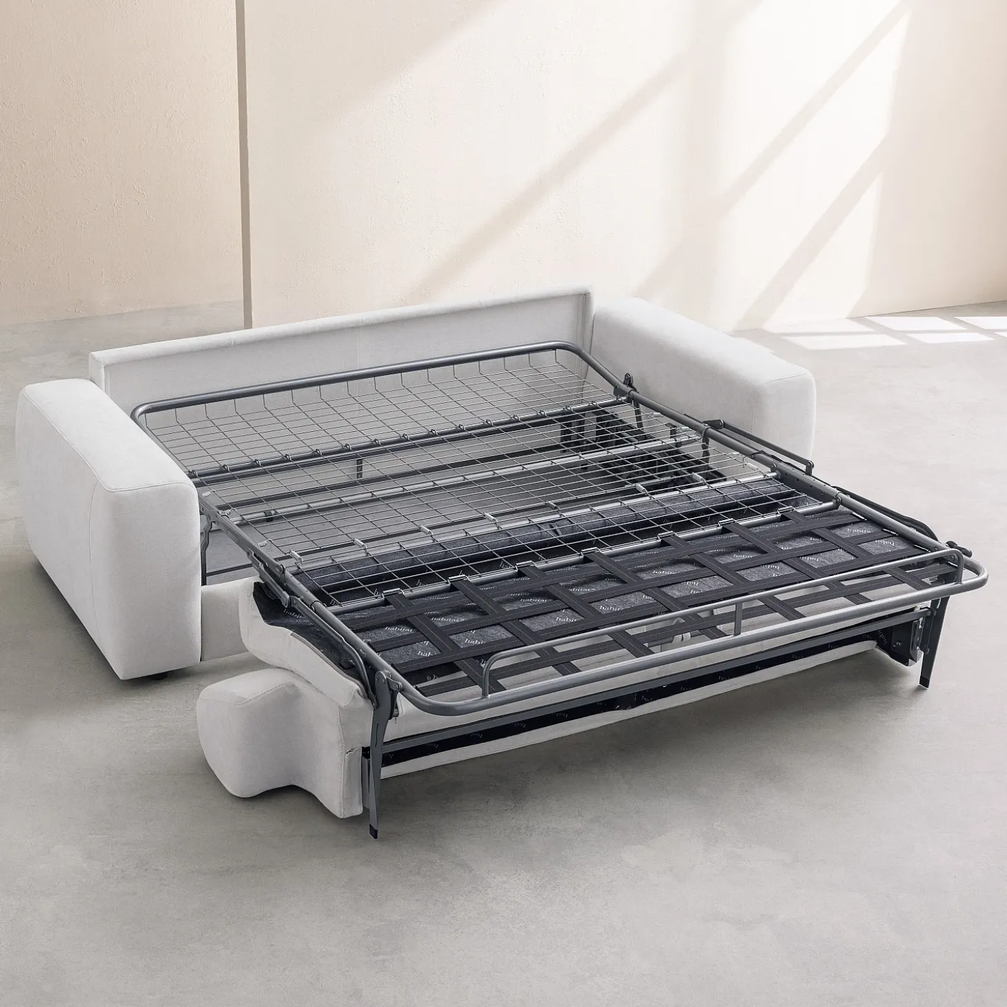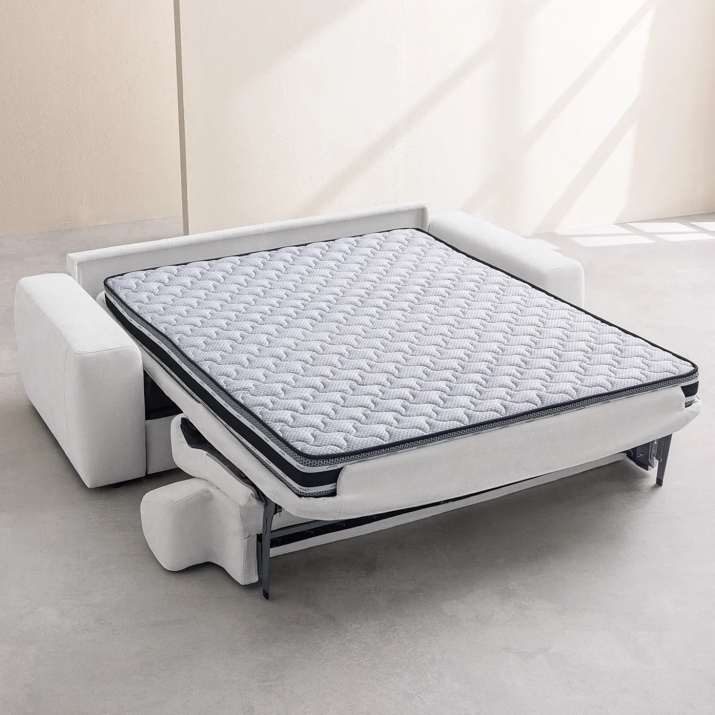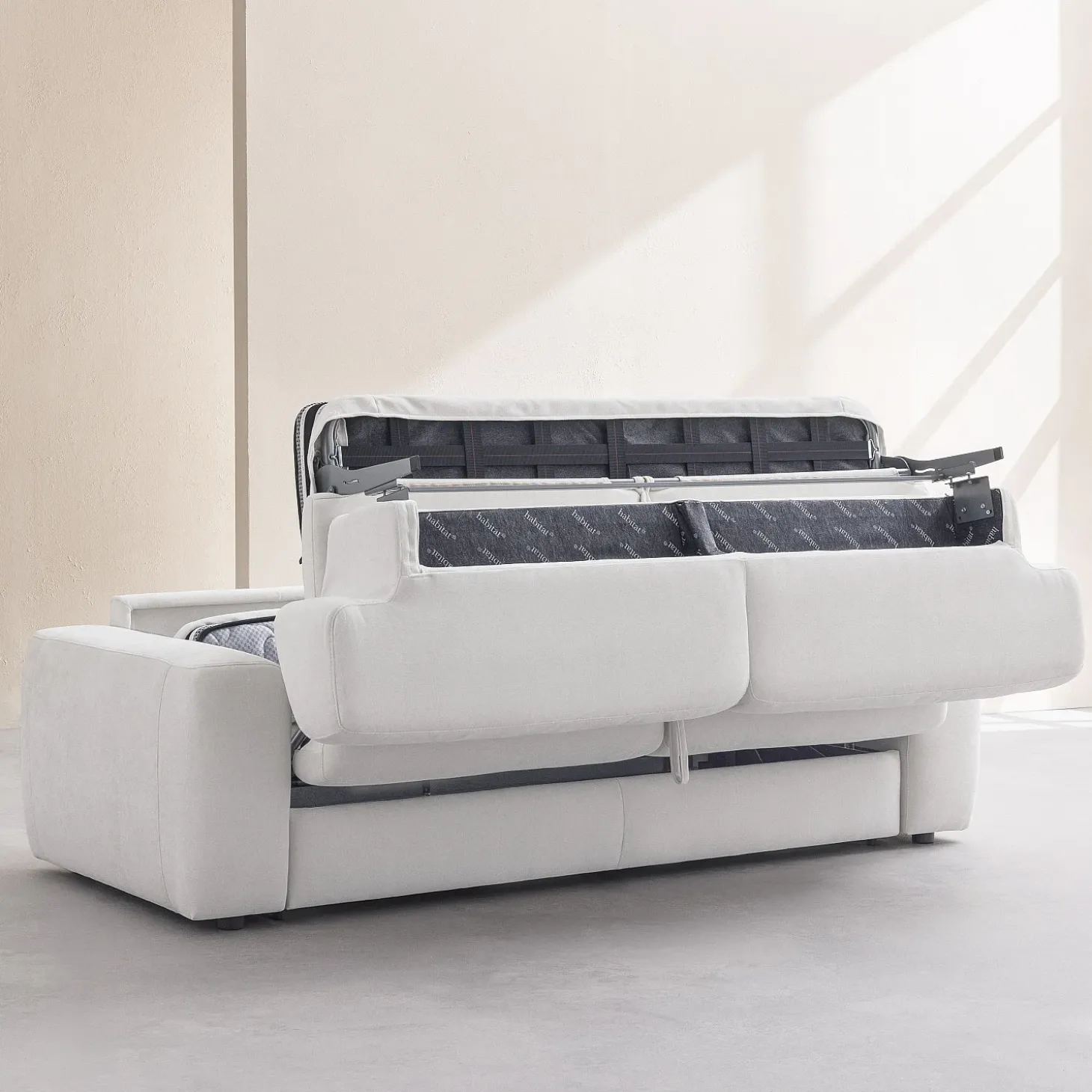 Le canapé convertible 3 places Faro s’habille d’un tissu Atrani, un textile doux à la teinte crème lumineuse. Ce revêtement offre un entretien facilité grâce à sa technologie empêchant la poussière de s’incruster.