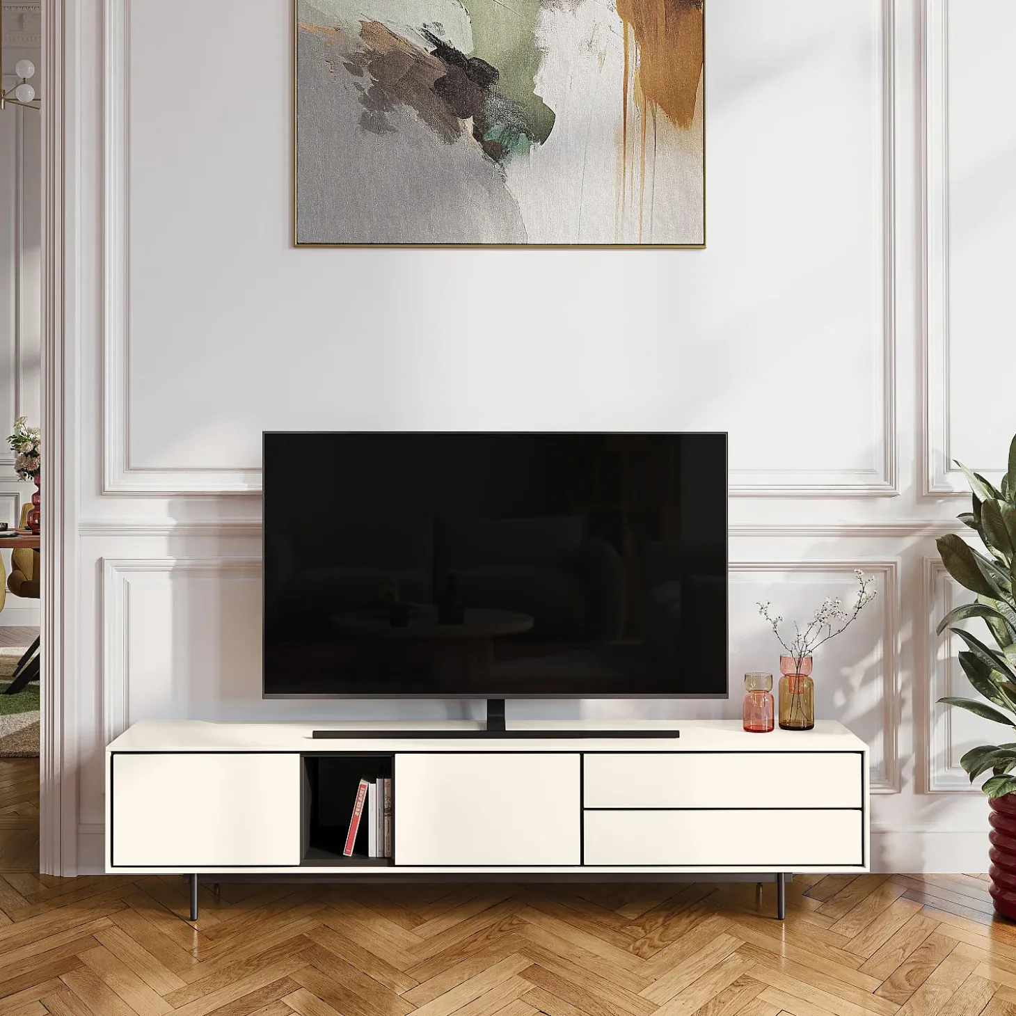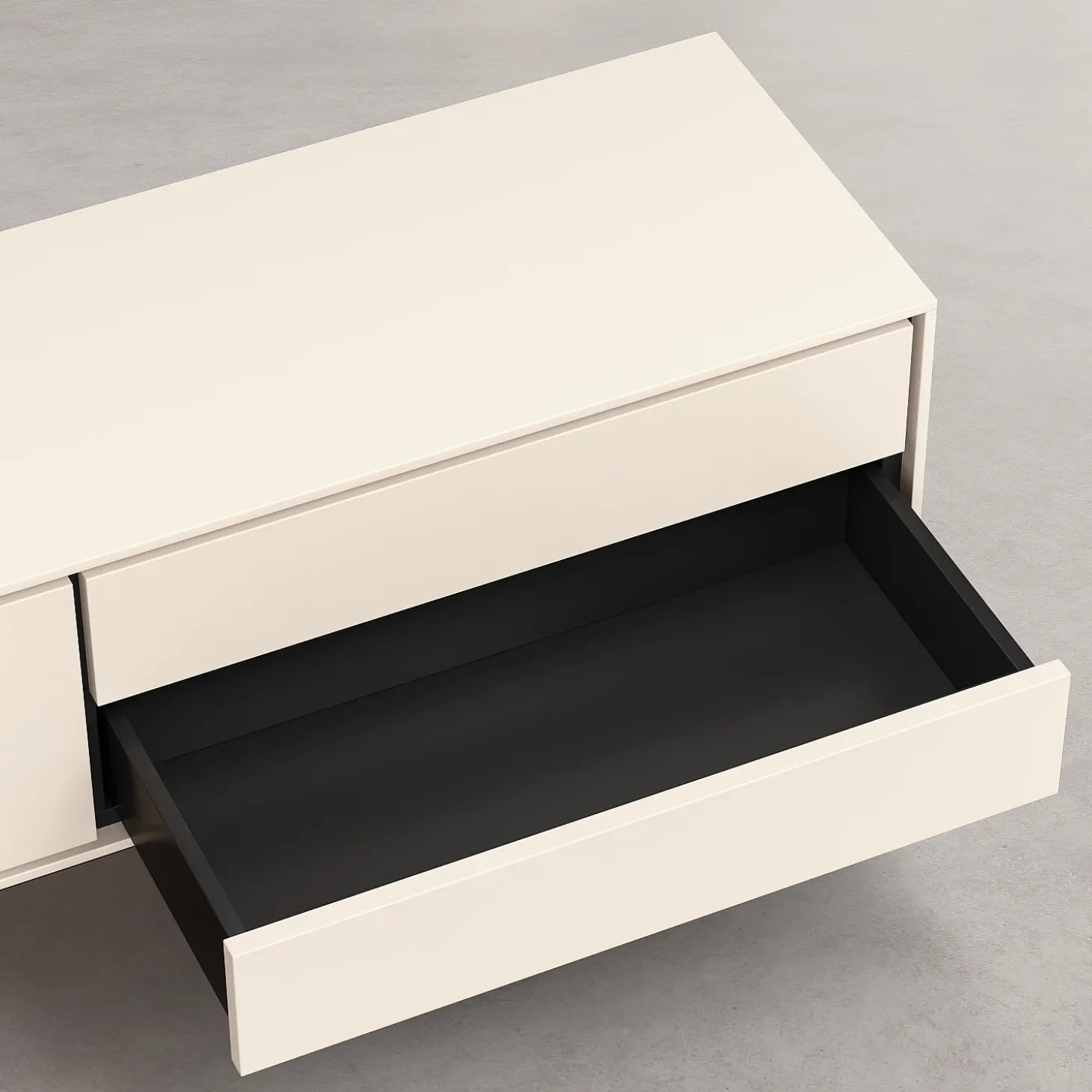 Ses deux portes et deux tiroirs offrent un rangement généreux, dissimulé derrière une façade structurée aux lignes nettes et à la précision graphique affirmée. Sa finition laquée beige diffuse une profondeur élégante et une douceur visuelle, tandis que les lignes sombres qui soulignent les contours créent un contraste raffiné, accentuant la rigueur de la confection.