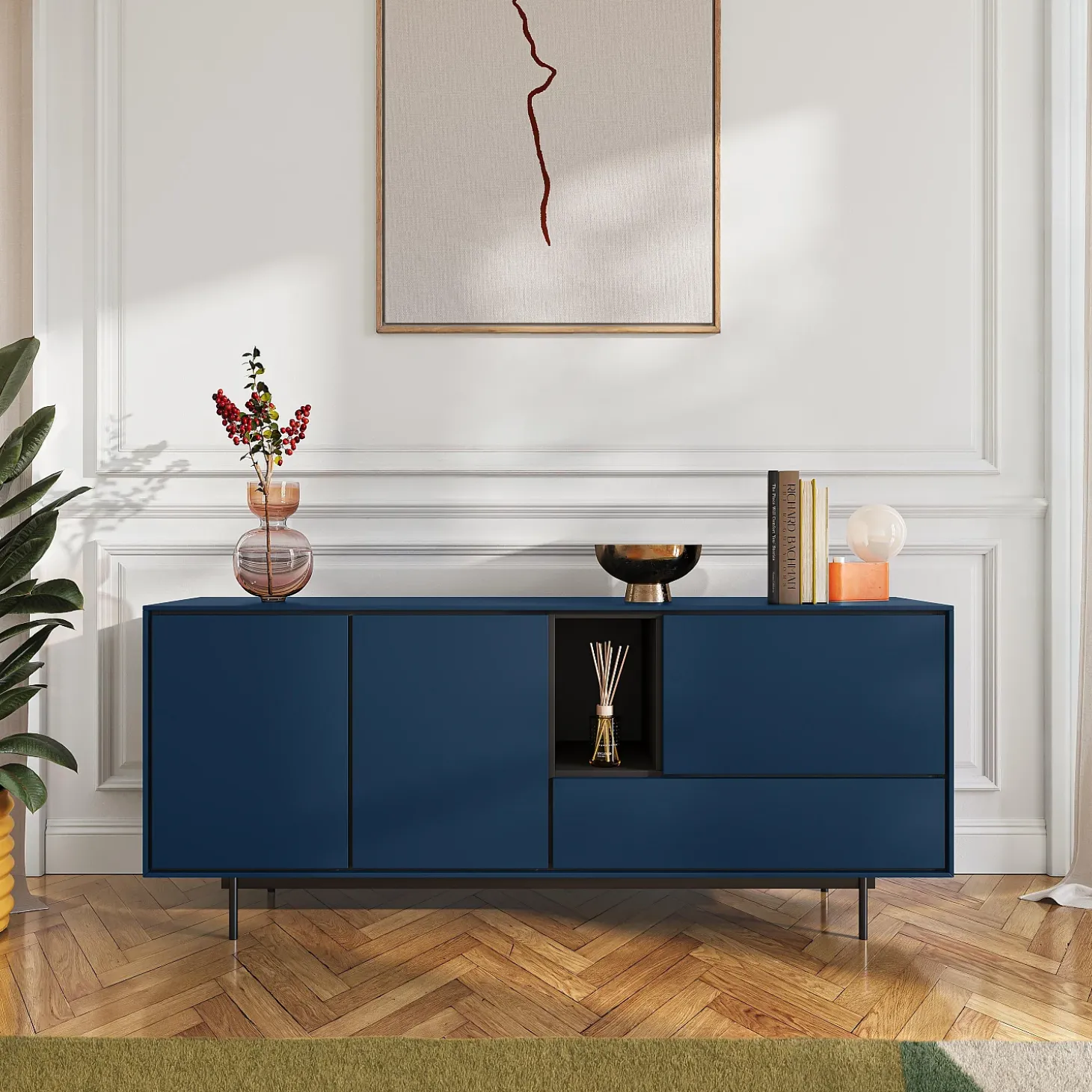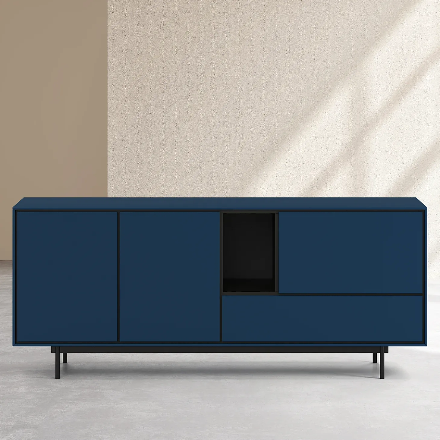 Doté de trois portes et d’un tiroir, il offre des espaces de rangement généreux subtilement intégrés à une structure épurée. Sa finition laquée bleu pétrole diffuse une profondeur élégante et une douceur visuelle, tandis que les lignes sombres qui soulignent les contours créent un contraste raffiné, mettant en valeur la rigueur de la confection.