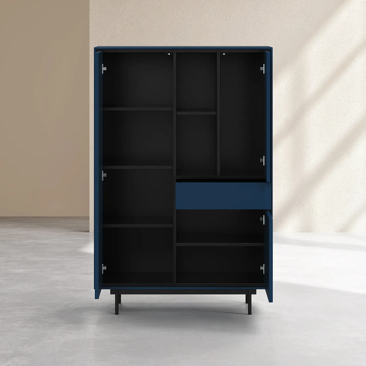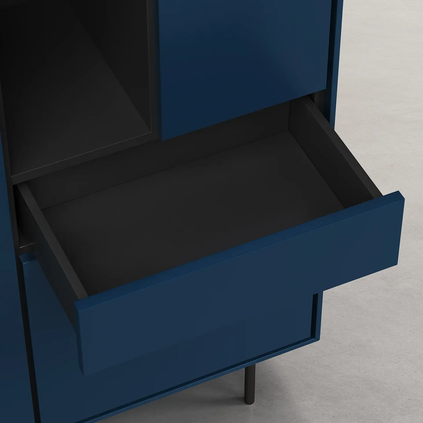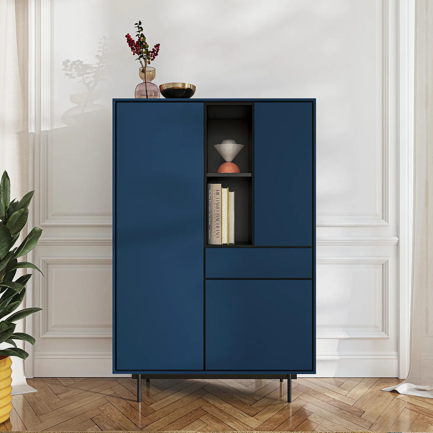Doté de trois portes et d’un tiroir, il offre des volumes de rangement généreux intégrés avec précision. Sa finition laquée bleu pétrole diffuse une profondeur élégante, tandis que les lignes sombres qui soulignent les contours créent un contraste raffiné, mettant en valeur la rigueur de la confection.
