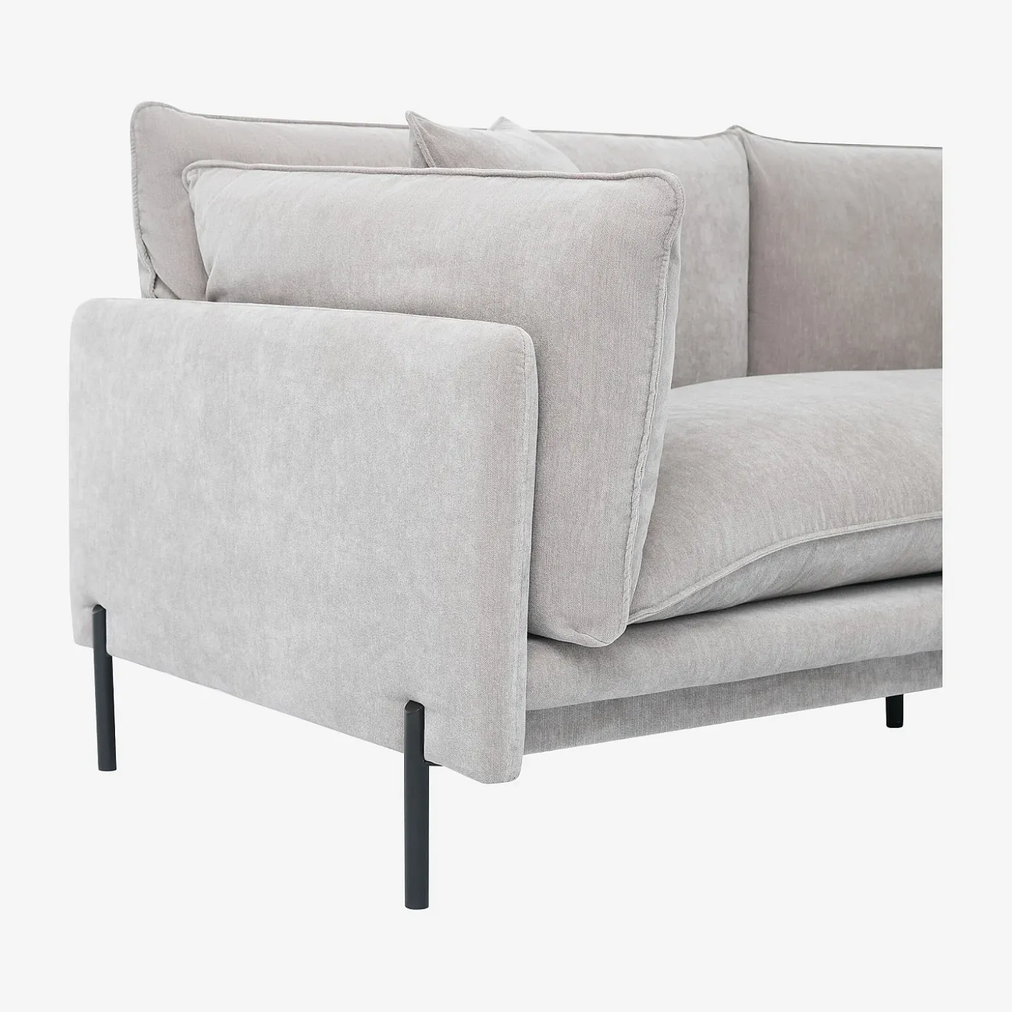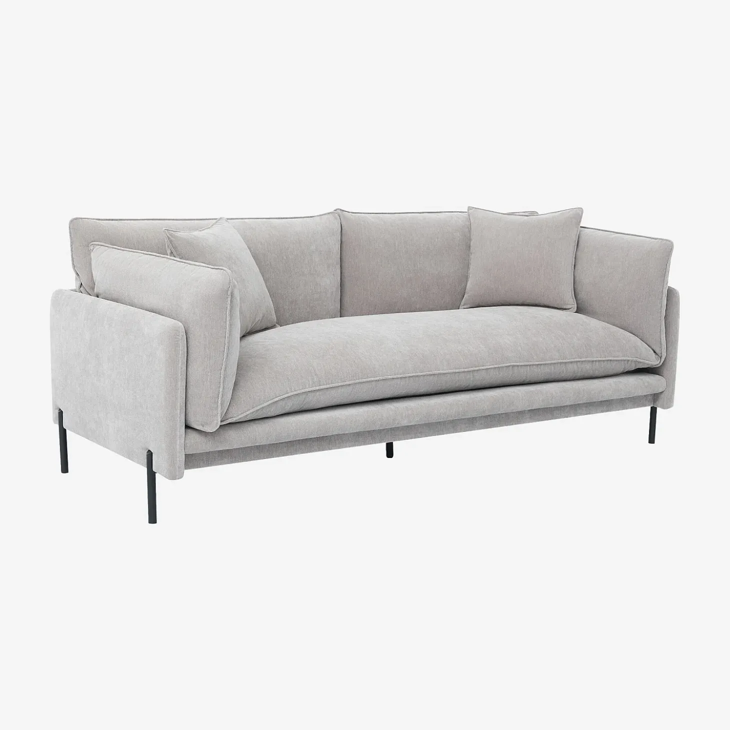 Ses pieds en métal noir créent un espace aéré, tandis que son revêtement en tissu doux insuffle une élégance chaleureuse, soulignée par deux coussins décoratifs pour un ensemble équilibré. Harmonieuse, sa teinte gris perle est à la fois chic et moderne, idéale pour une décoration d’intérieur intemporelle.