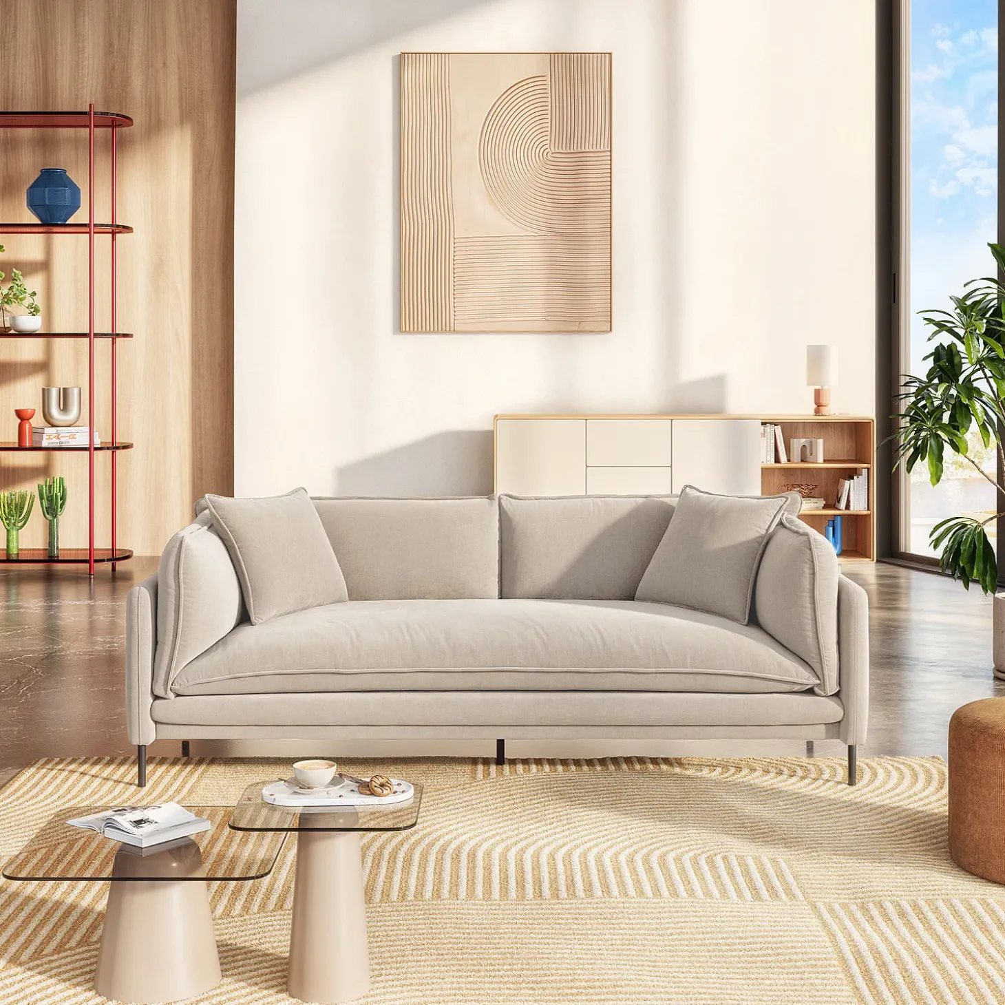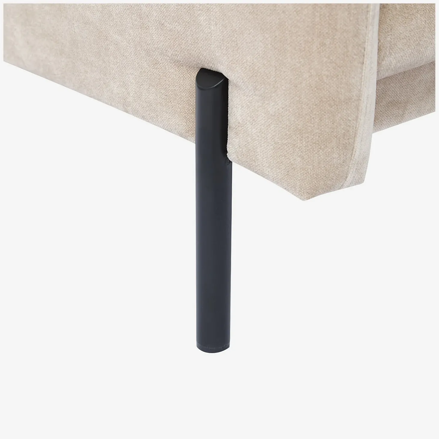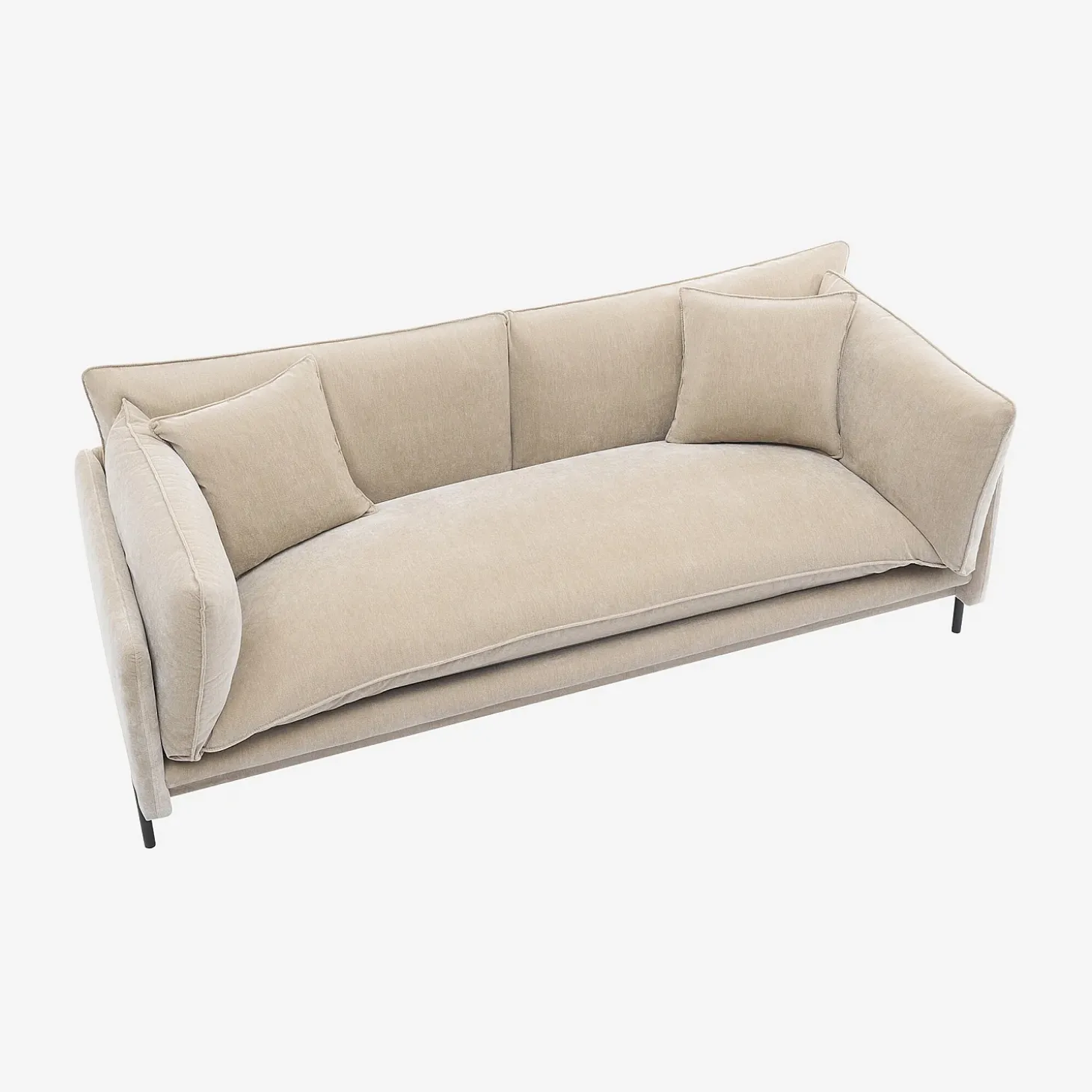 Ses pieds en métal noir créent un espace aéré, tandis que son revêtement en tissu doux insuffle une élégance chaleureuse, soulignée par deux coussins décoratifs pour un ensemble équilibré. Sa couleur taupe réchauffe l’atmosphère d’une pièce, ajoutant une touche de chic à la décoration intérieure.