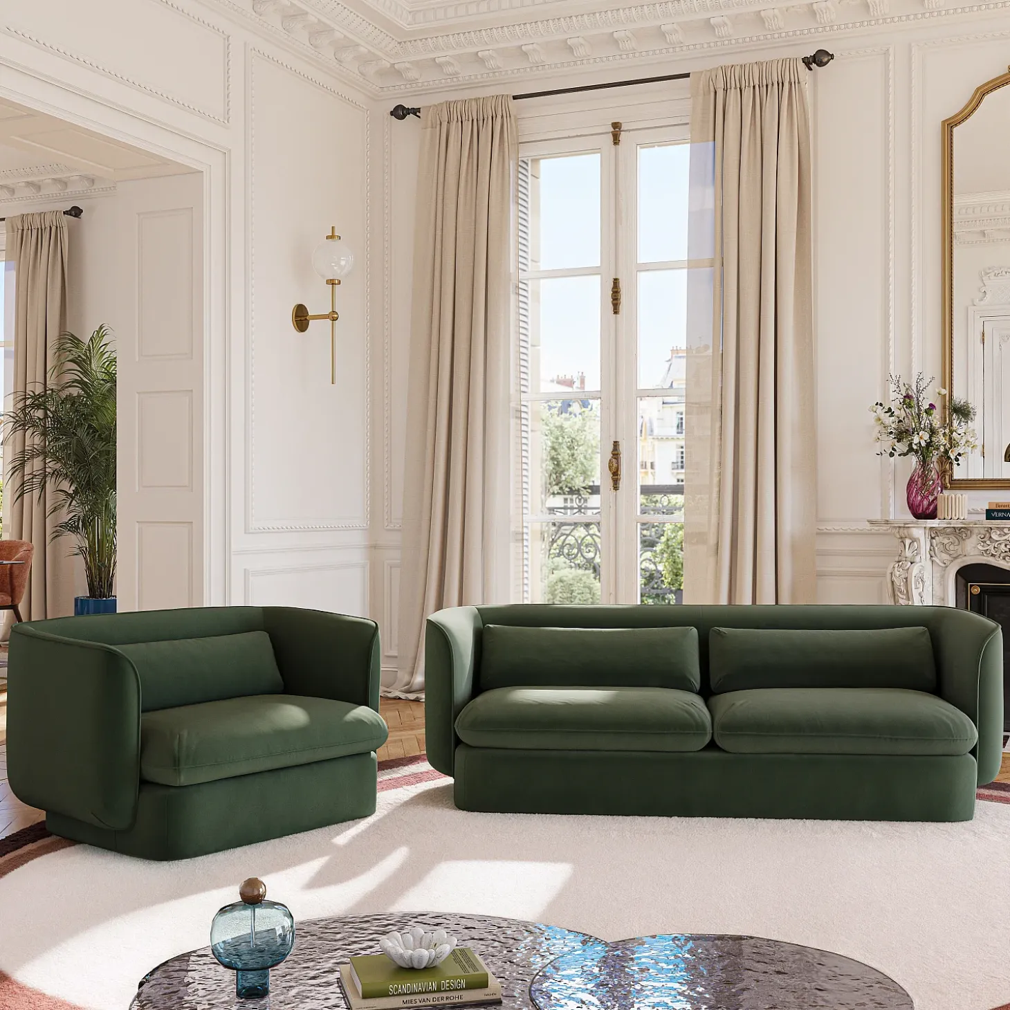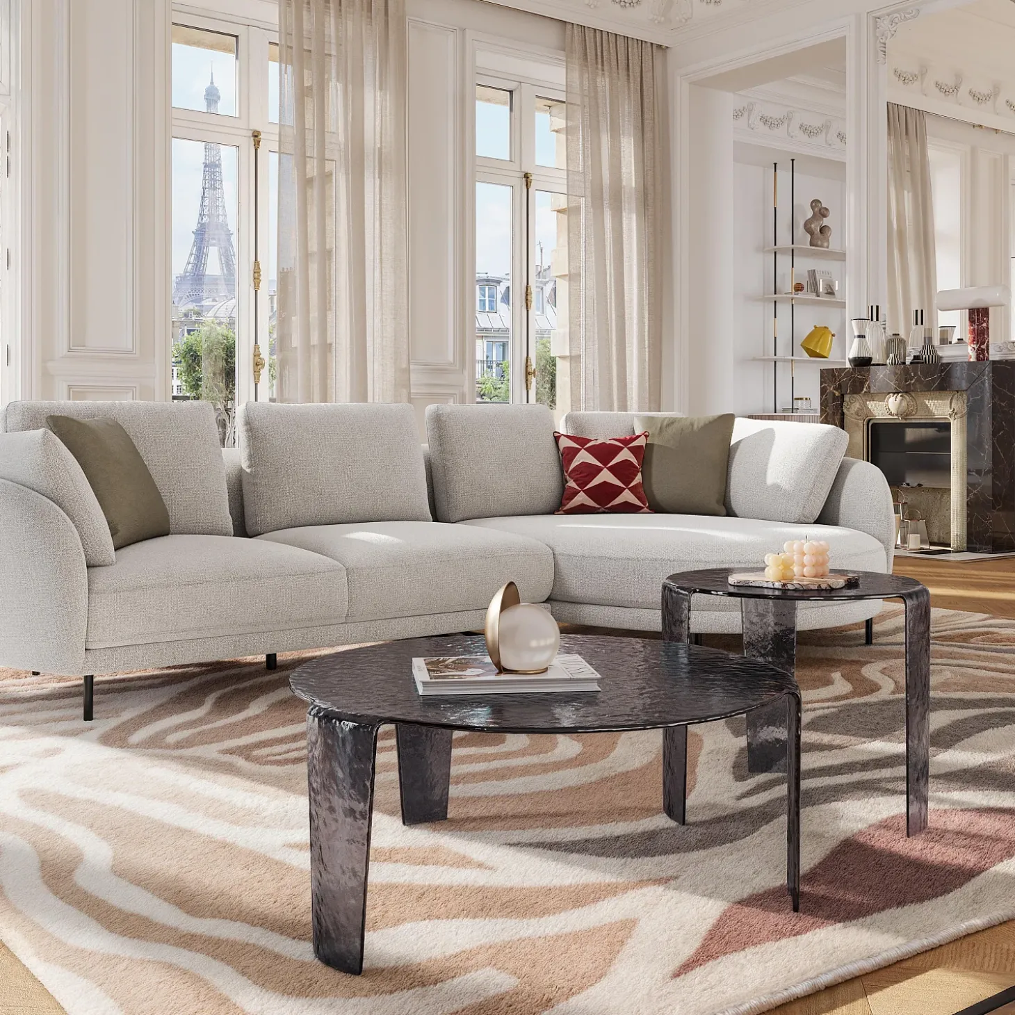 Pensé pour apporter du rythme à un intérieur contemporain, l’ensemble Fegina compose un dialogue élégant entre formes, transparence et matière.