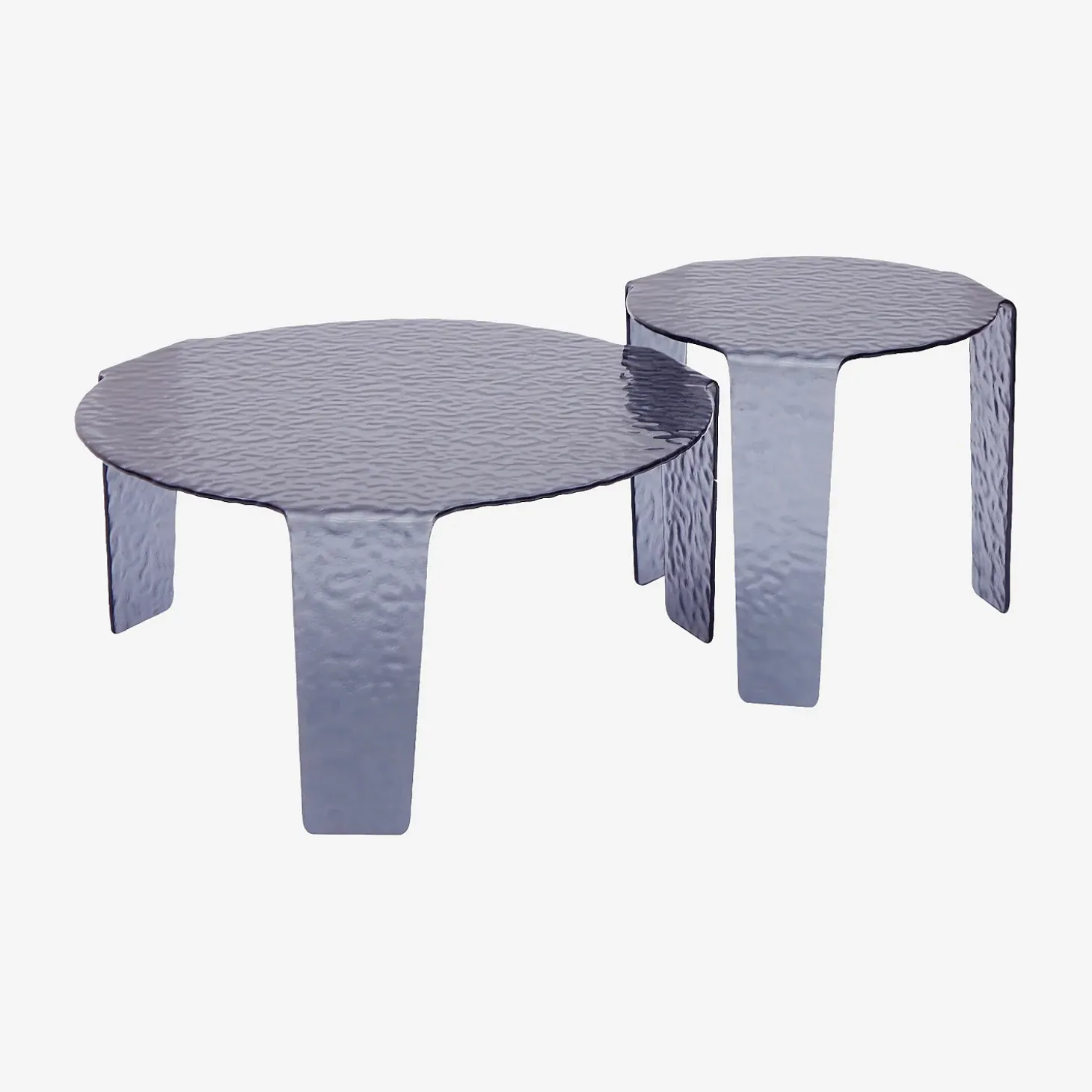 Charge maximale supportée : 30 kg par table basseLignes sculptées, verre bullé et teinte fumée définissent ce duo de tables aux formats complémentaires. Un ensemble graphique et aérien qui joue sur les contrastes et la lumière.