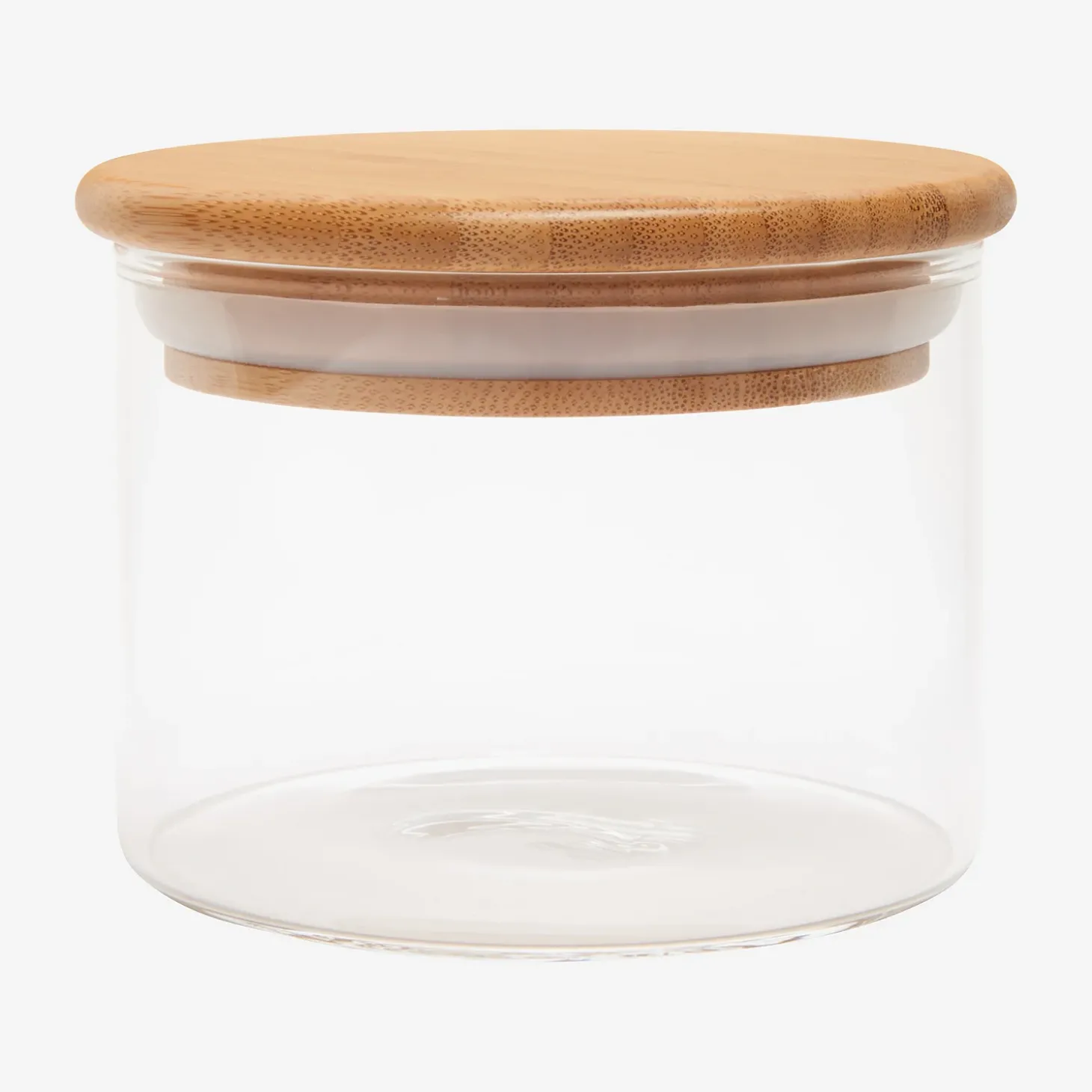 Le bocal Ferm de 10 cm de diamètre et 8 cm de hauteur est en verre borosilicate et possède un couvercle en bambou. Le borosilicate est une matière reconnue pour sa haute malléabilité et sa grande résistance aux températures. Ainsi lorsqu’il ne protège pas des aliments secs, il peut contenir des déconctions chaudes.