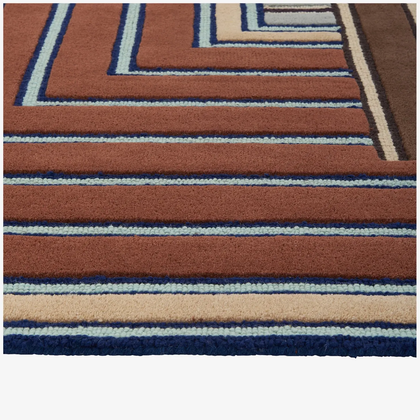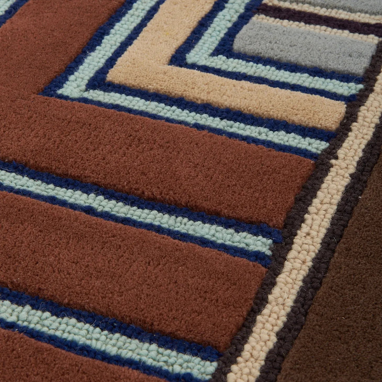 Les tons bruns, chaleureux et profonds, sont contrebalancés par des accents de bleu électrique, bleu ciel et jaune pâle, qui apportent un contraste frappant et raffiné. Ce jeu de couleurs offre un équilibre subtil entre force et légèreté, tout en soulignant l’élégance discrète de la laine tuftée.