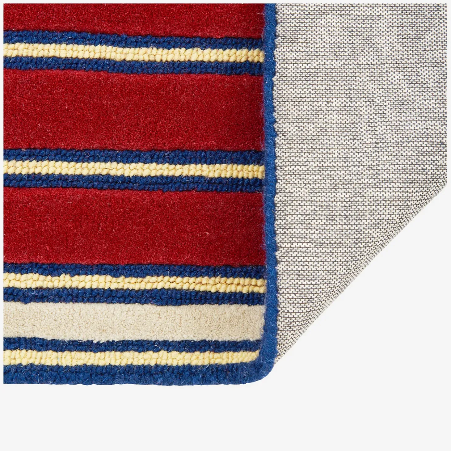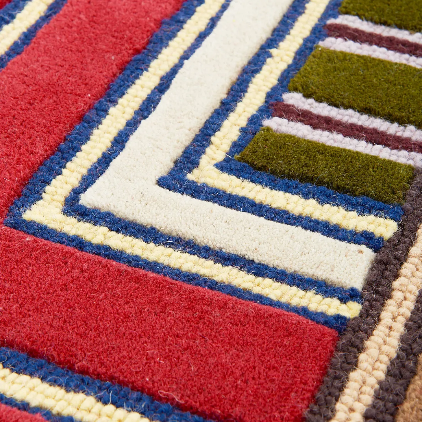 Dominé par des tons rouges profonds et vibrants, ce tapis est ponctué de touches d’orange, de vert et de bleu ciel, qui apportent de la fraîcheur et de la légèreté à la palette chaude. La juxtaposition de ces couleurs, tout en contrastes, génère une énergie vivante et contemporaine, renforcée par la richesse tactile de la laine tuftée.