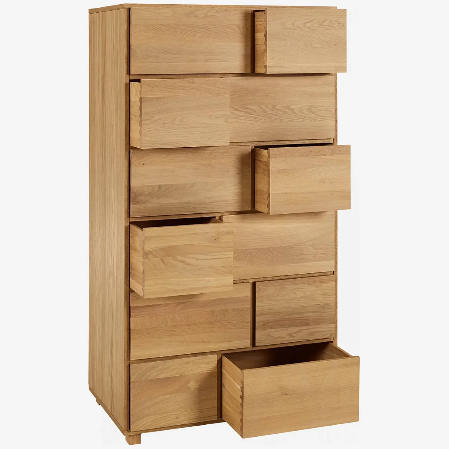 Aussi design que fonctionnelle, le chiffonnier Hanita est en chêne et possède 12 tiroirs en chêne massif sur 6 niveaux. Il optimise votre espace en multipliant les rangements. Chaque tiroir peut être dédié à un type de vêtements, d’effets personnels ou de documents importants.
