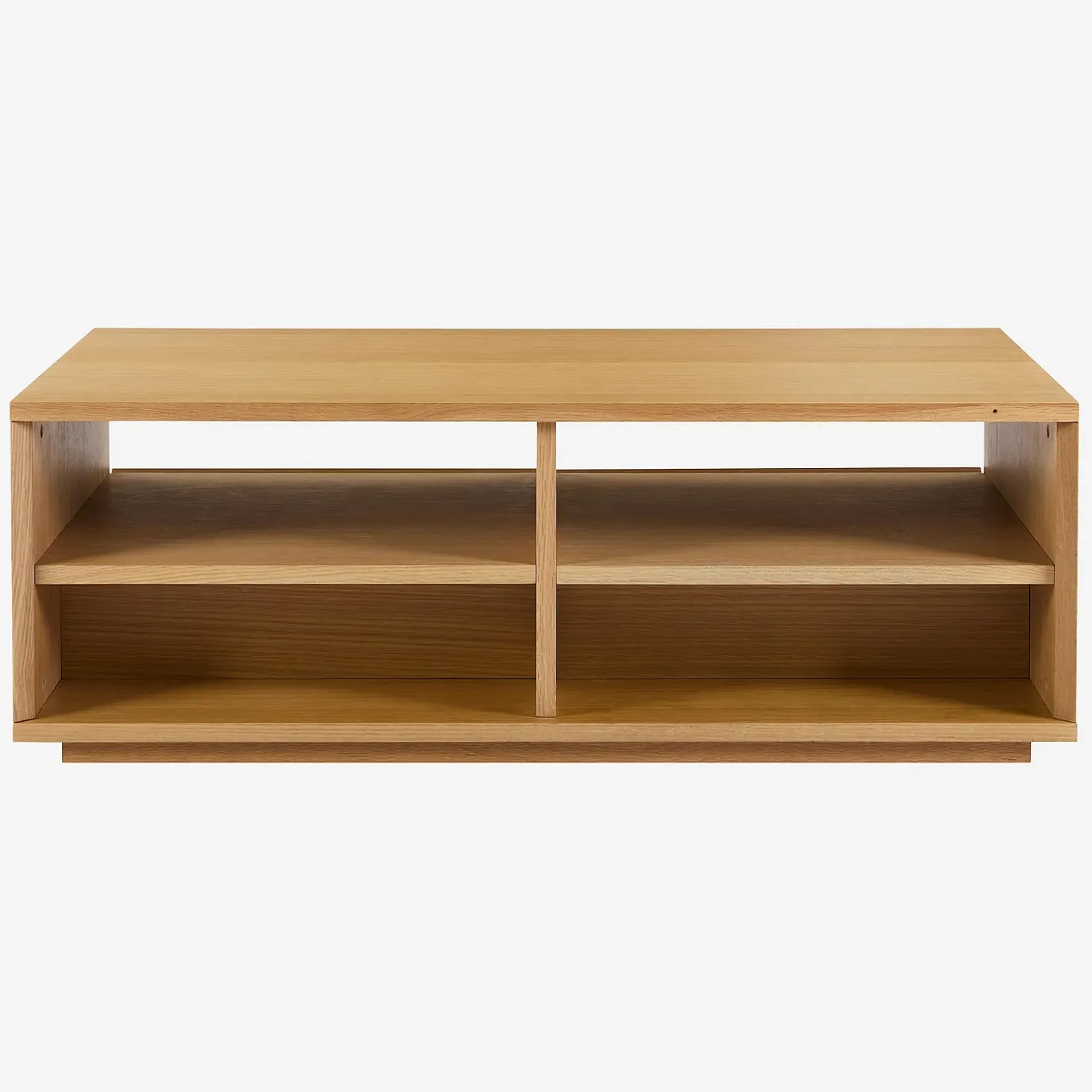 La table basse avec rangements en chêne Hazo s’invite dans le salon, apportant une note authentique.