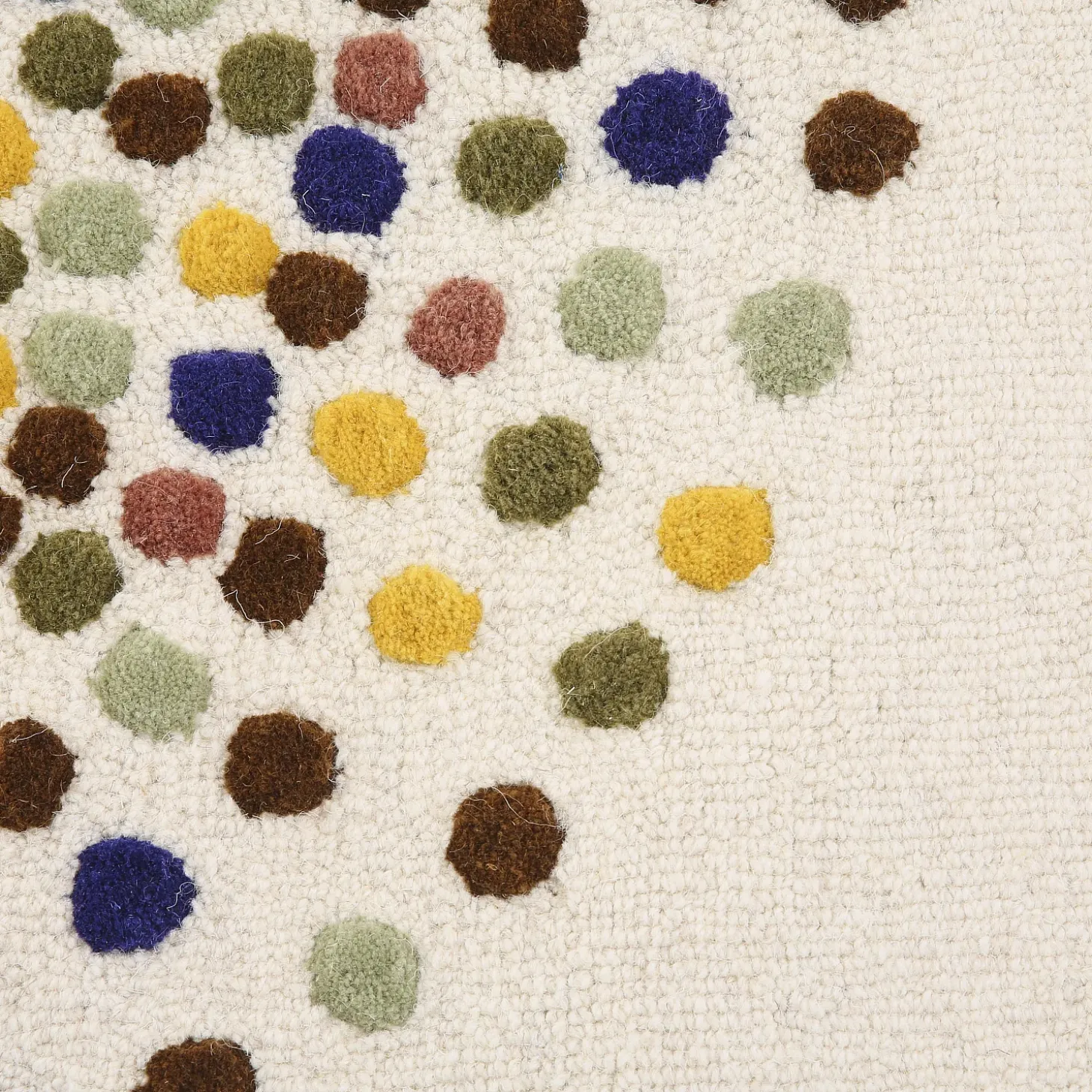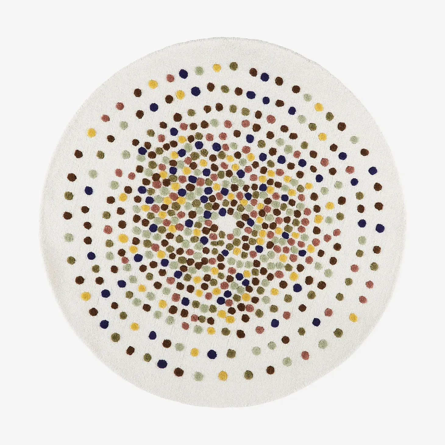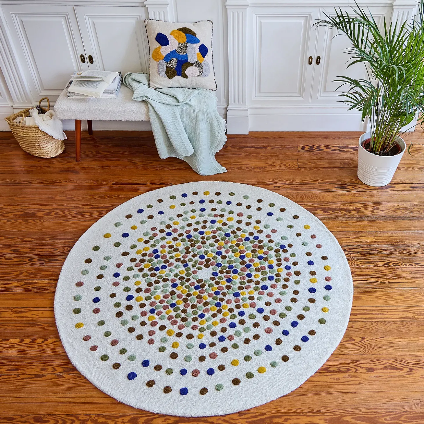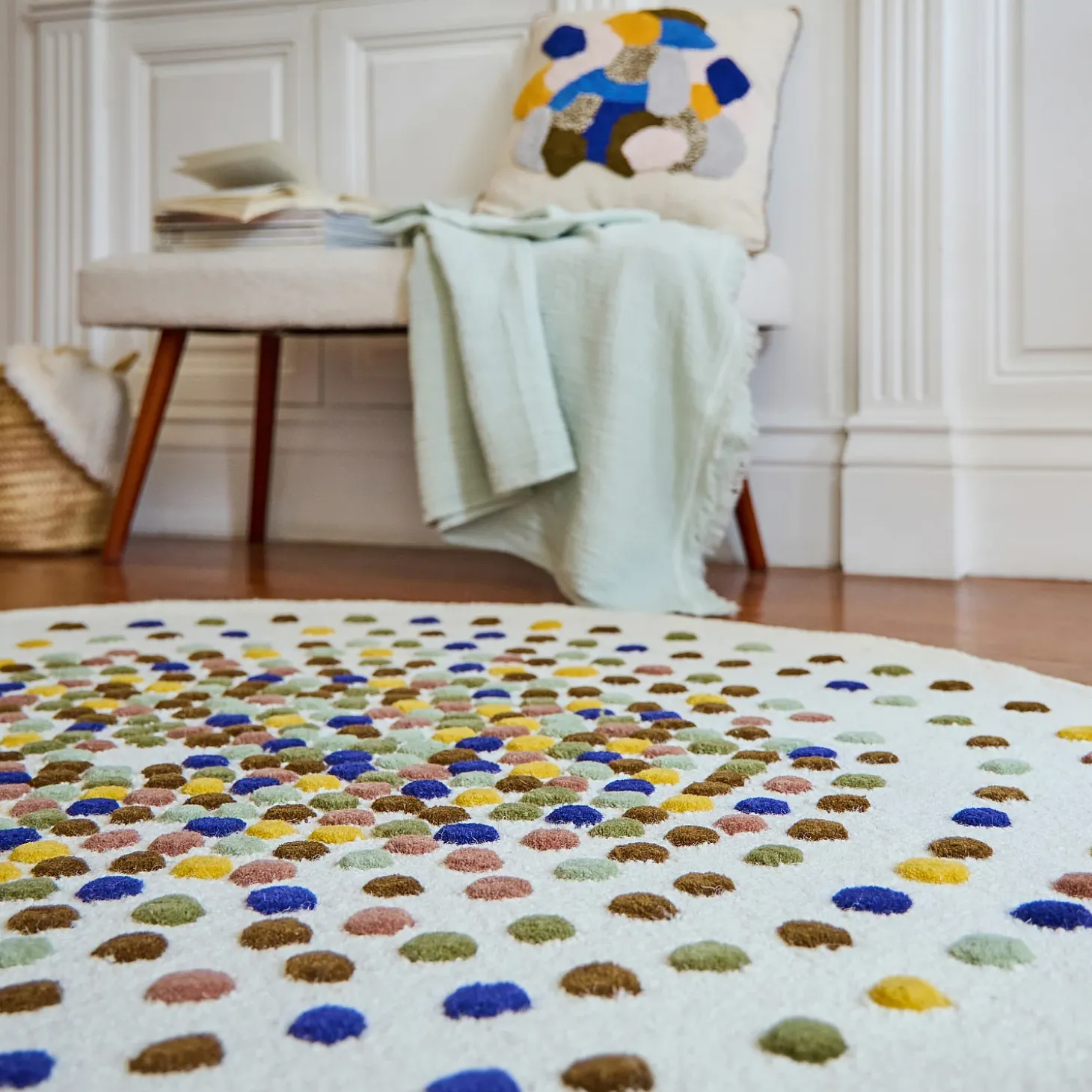 Le tapis rond 150 cm Idylle s’inspire de l’univers du kaléidoscope : une multitude de pois colorés disposés en composition libre. Le motif évoque la légèreté, la lumière, et l’enfance — un parti-pris chaleureux et accueillant. Ce tapis 100% laine est tufté à la main par des artisans indiens. Chaque fil est piqué, coupé, puis brossé pour faire ressortir la texture et le confort.