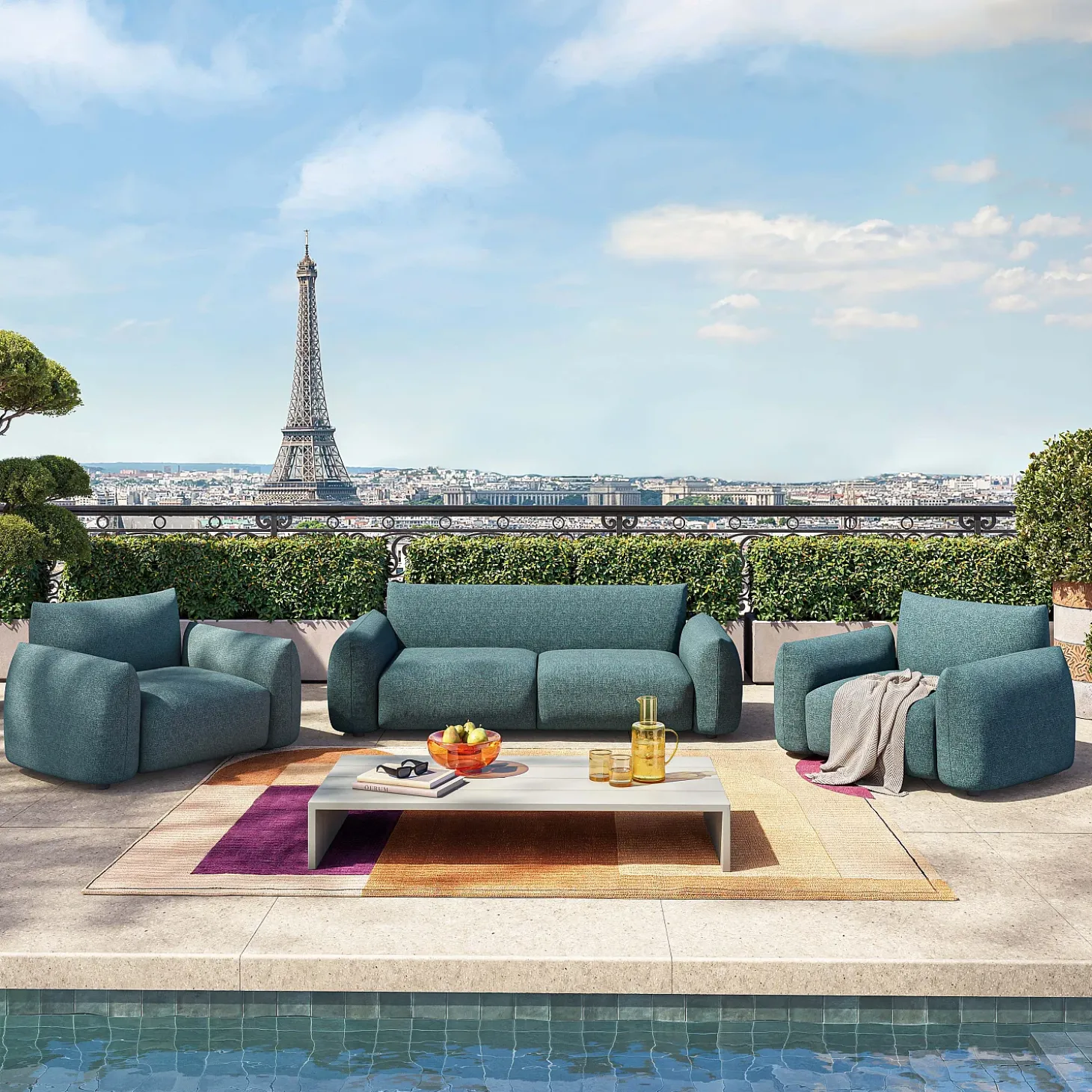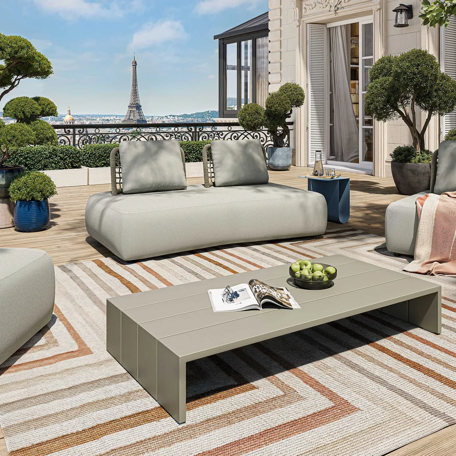 En gris soie, la table basse Imarui prend place sur les terrasses et dans les jardins avec discrétion, modernité et intemporalité.