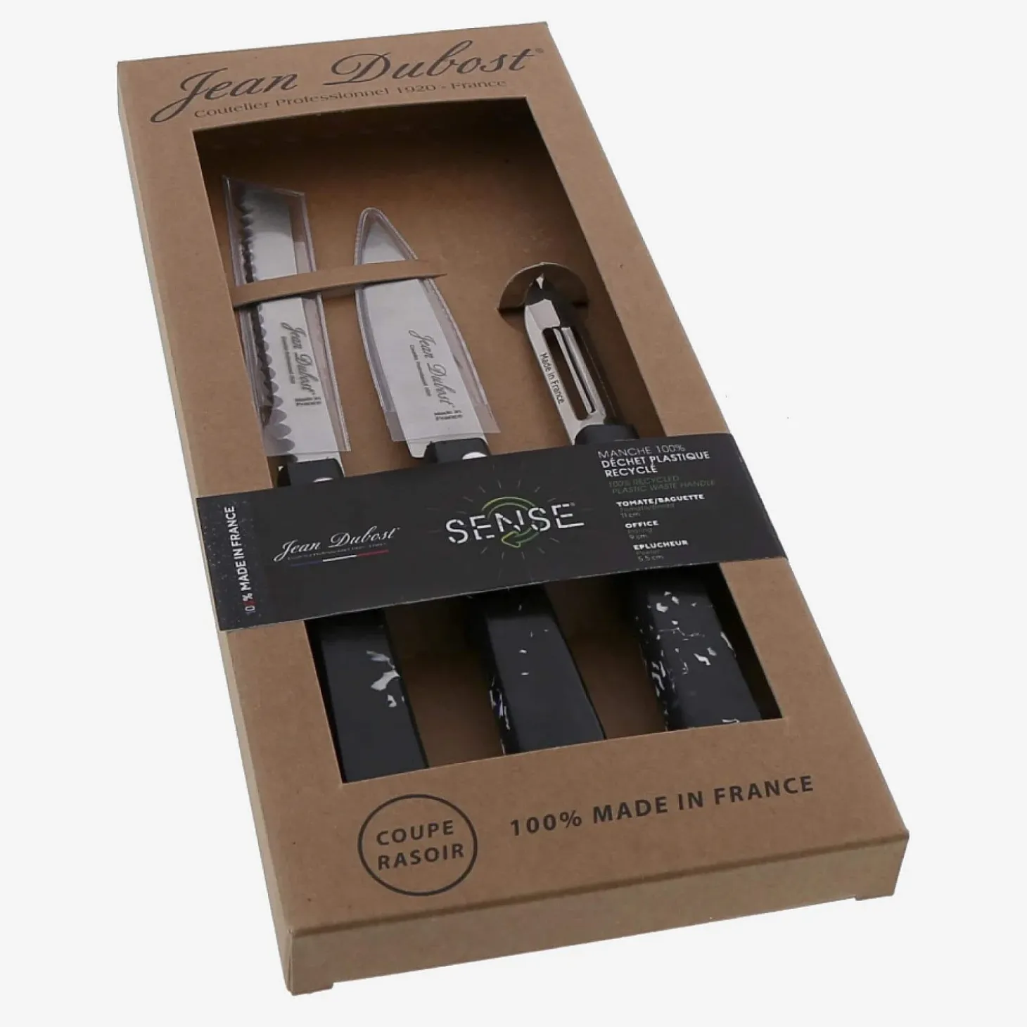 Le set de 3 couteaux Jean Dubost de la gamme Sense se compose d’un couteau à tomate, d’un couteau d’office et d’un éplucheur. Ces couteaux possèdent des lames en acier inoxydable et des manches de couleur noire. Ces manches utilisent des matériaux recyclés issus de la collecte française de déchets en plastique afin de s’inscrire dans une économie circulaire.