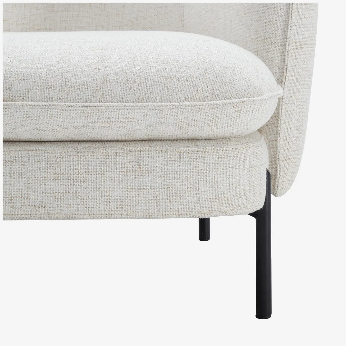 Ses pieds fins en métal noir contrastent avec le coloris ivoire du tissu, apportant une touche de modernité à l’ensemble.
