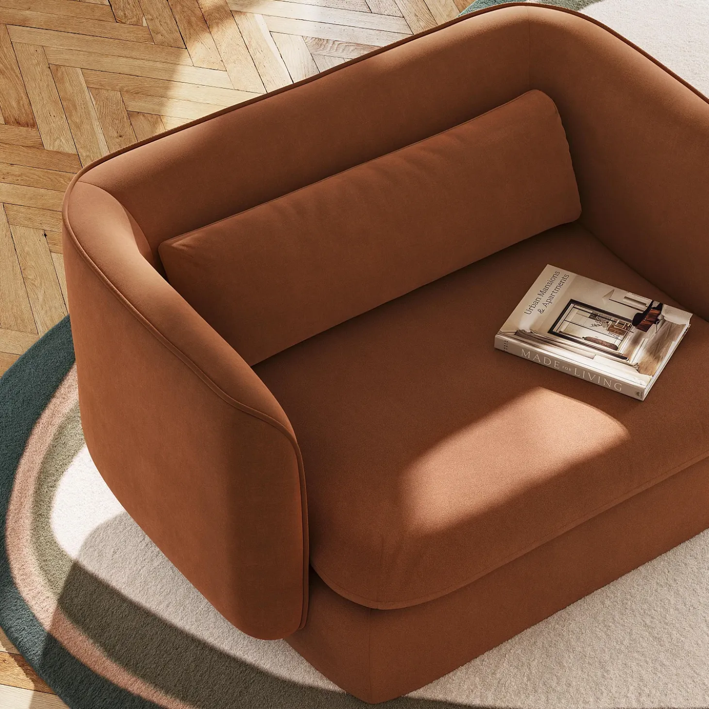 Le fauteuil Kalmia terracotta prolonge l’expérience de confort avec une assise moelleuse et accueillante.