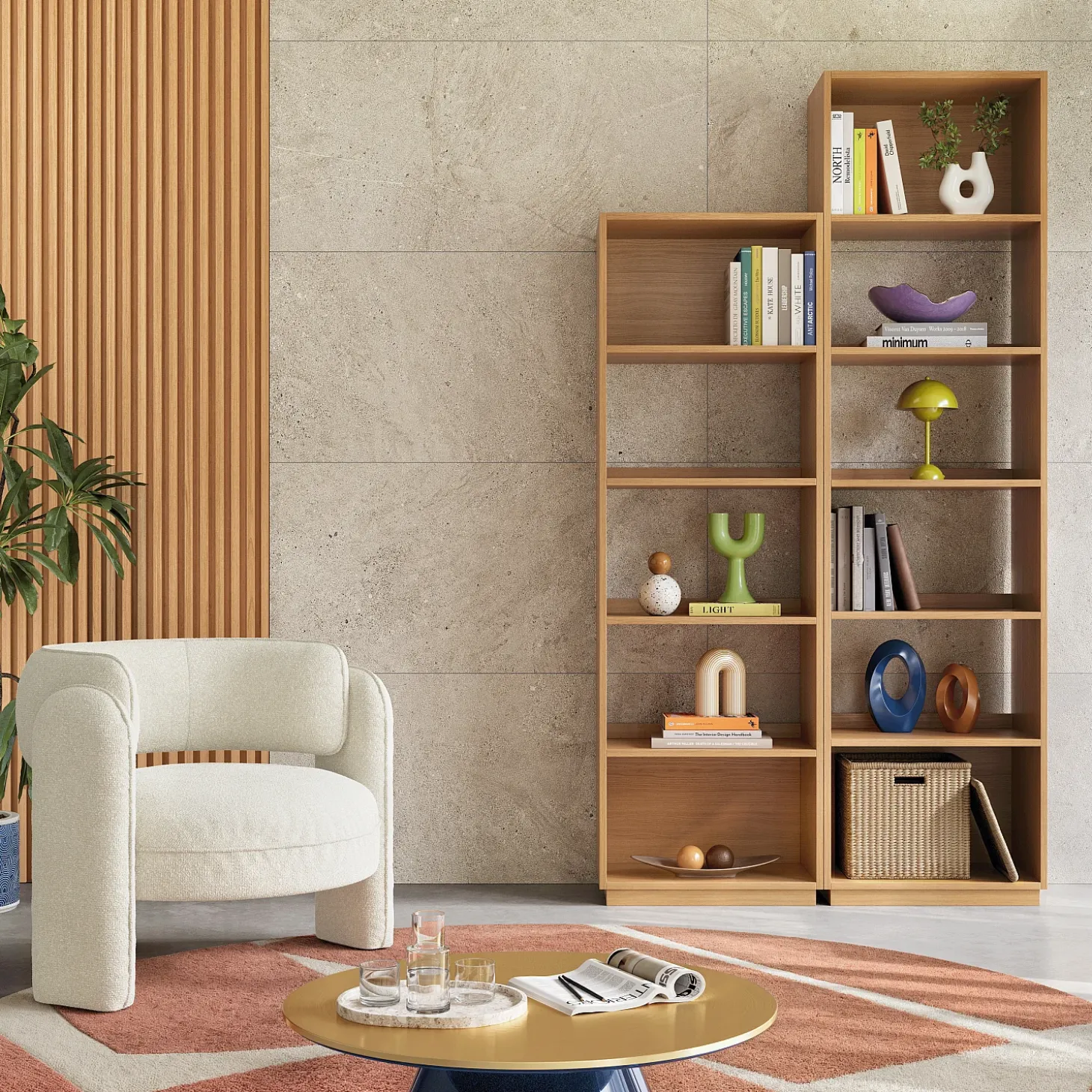 Charge maximale supportée par les étagères : 10 kgKuda joue sur le rythme entre niches ouvertes et rangements fermés pour structurer l’espace avec équilibre. Une bibliothèque graphique et fonctionnelle, pensée pour accueillir livres et objets avec style.
