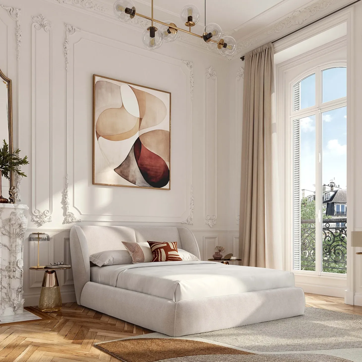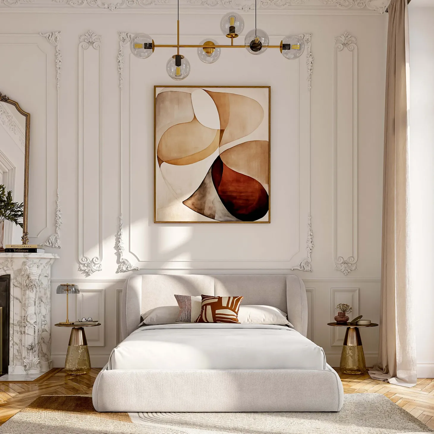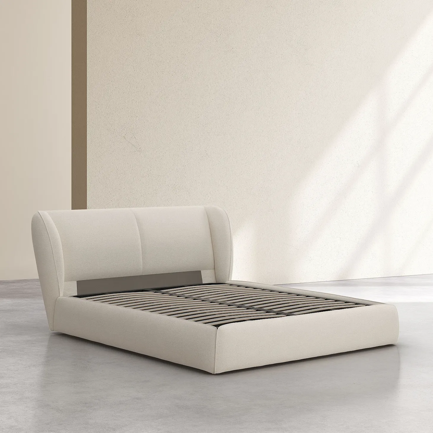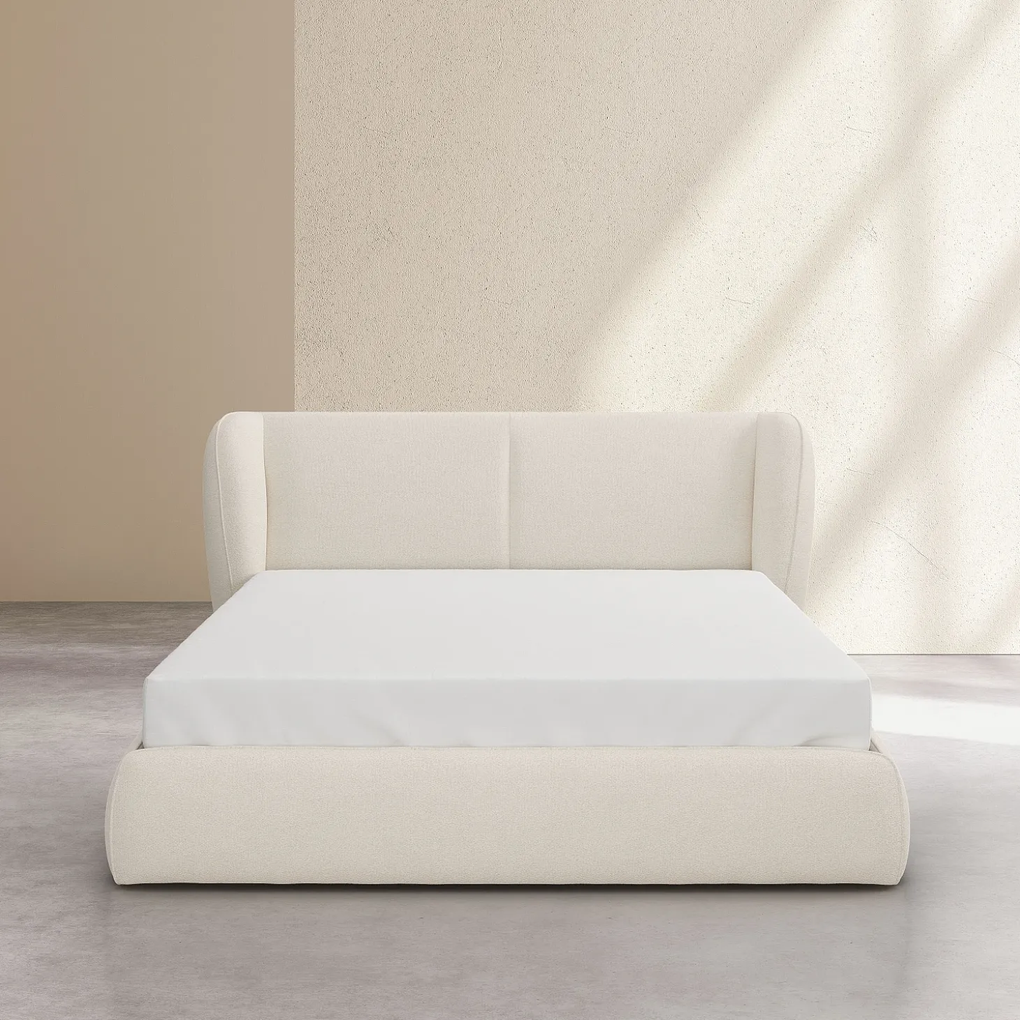 Du cadre à la tête de lit, il est entièrement habillé d’un tissu bouclette beige meringue. Ce revêtement texturé, à la fois tendance et chaleureux, crée une harmonie visuelle chic et épurée.