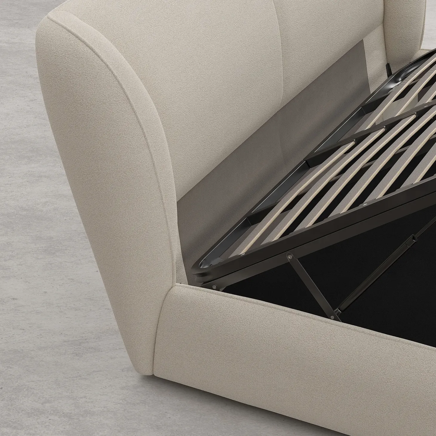En format queen size, il optimise le confort tout en proposant un espace de rangement astucieux grâce à sa fonction lit-coffre. Le design aux rebords courbés de la tête de lit molletonnée offre un appui stable et enveloppant.