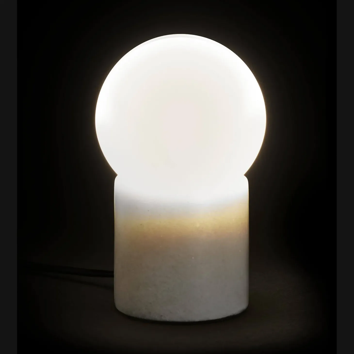Cette lampe de table est composée d’un globe en verre dépoli et d’un socle en marbre <dynamiclink target=