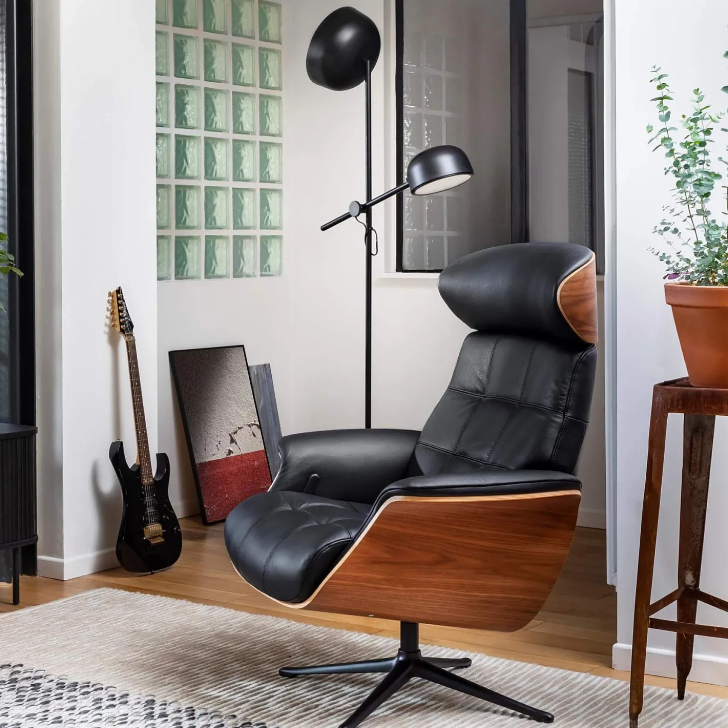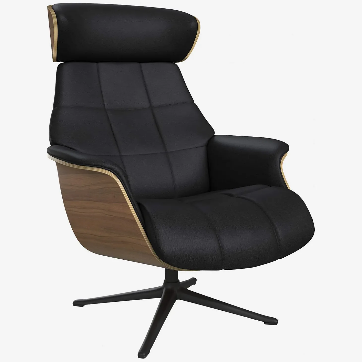 Le fauteuil Marc en noyer et cuir Savoy noir obsidienne avec pied noir offre un confort ultime, grâce à son dossier inclinable et à sa têtière ajustable en hauteur.
