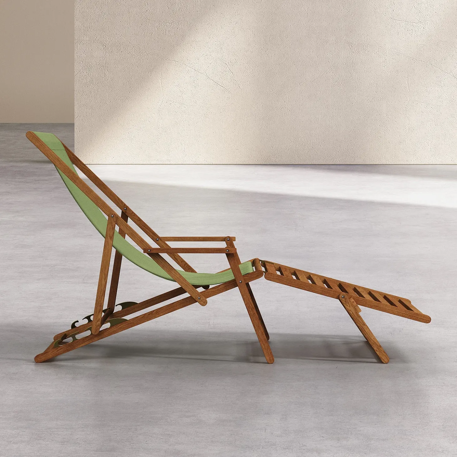 Son dossier incliné, prolongé par le repose-pieds, invite à la détente, tandis que la teinte vert olive diffuse une douceur lumineuse dans tous les espaces extérieurs.